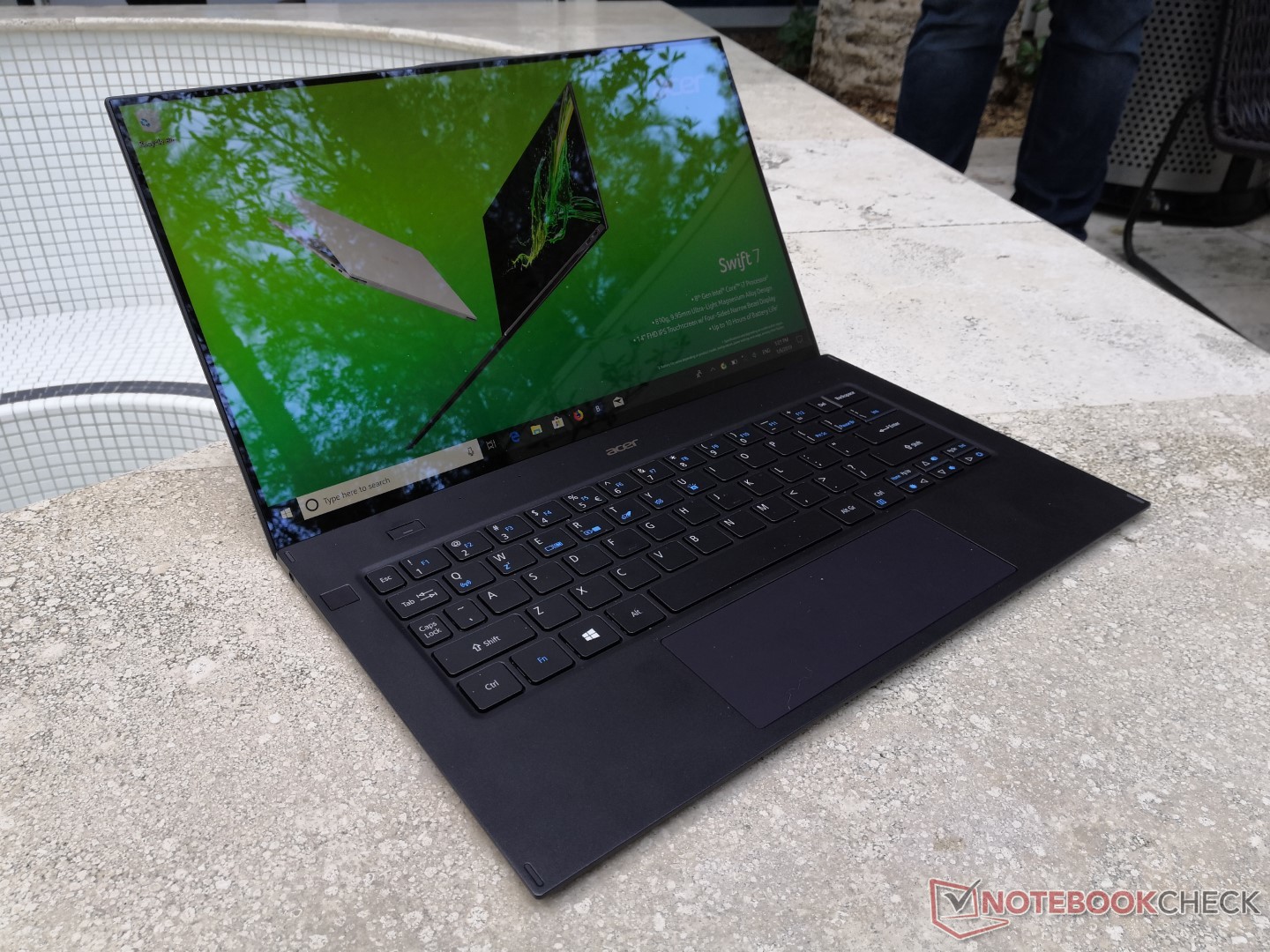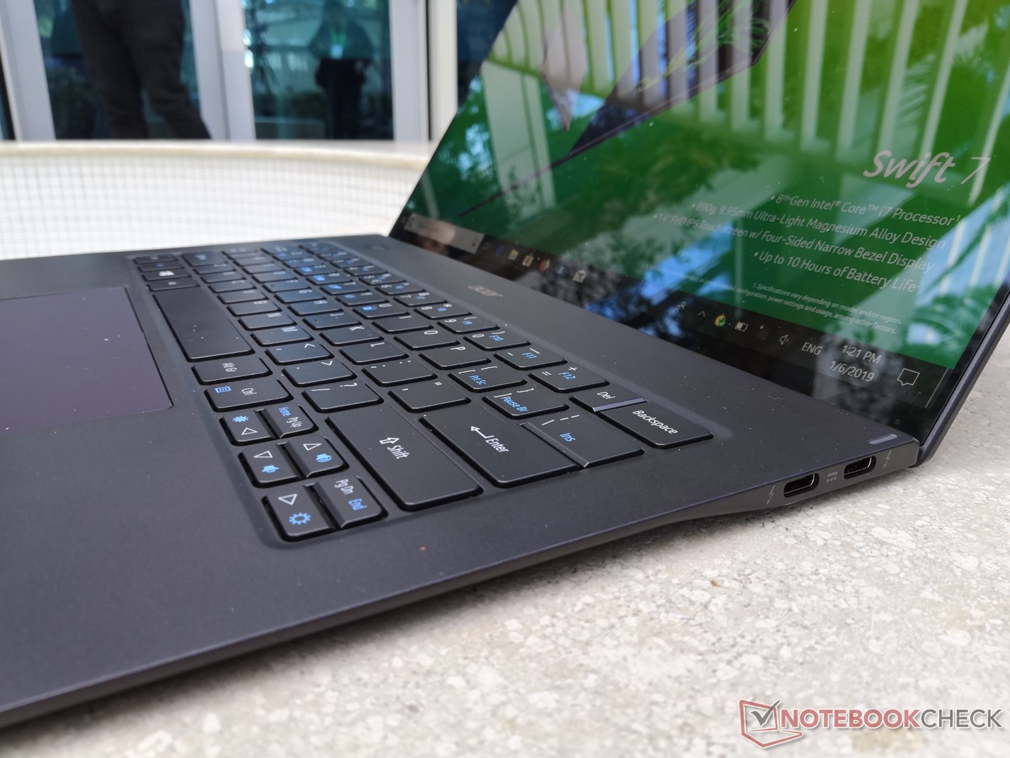 Das 14 Zoll große Display unterstützt Touch-Eingabe und dürfte dank Gorilla Glas 6 recht robust sein. Dank 2,5 mm schmaler Ränder an allen vier Seiten erreicht Acer hier ein Screen-to-Body-Ratio von stolzen 92 Prozent. Auch das Volumen des Notebooks ist eindrucksvoll - das Swift 7 ist um ganze 40 Prozent kleiner als das aktuelle MacBook Air, welches auf ähnliche CPUs bei einem kleineren 13 Zoll Display setzt.