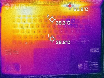 Bei den Oberflächentemperaturen beobachten wir im Leerlauf zunächst keine extremen Hotspots. Auch unter Last sehen wir nur in wenigen Bereichen Temperaturen über 40 °C. Im Vergleich zur Konkurrenz erwärmt sich das Gehäuse des Acer Swift Edge SFE16 etwas mehr. Als problematisch erachten wir dies jedoch nicht.