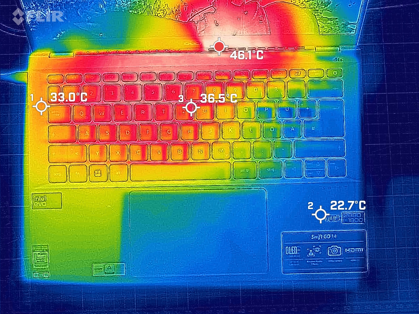 Was sich leider auch kaum geändert hat, sind die recht hohen Oberflächentemperaturen des Laptops, welche wir im Stresstest messen. Immerhin 40 °C erreicht die Leiste hinter der Tastatur. Am stärksten erwärmt sich jedoch der Bildschirm, auf welchen die Abluft des Lüfters gerichtet ist. Im Normalbetrieb beim Surfen oder in Office-Anwendungen erwärmt sich die Oberfläche des Laptops jedoch nicht weit über die Raumtemperatur.