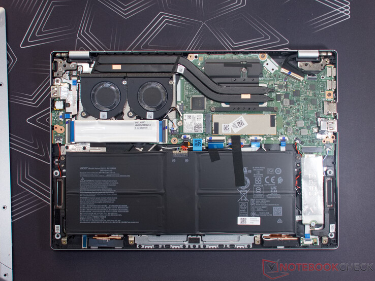 Zum Öffnen des Acer Swift Go haben wir nur einen TX5-Schraubendreher und einen Saugnapf benötigt. Wie auch schon beim Vorgänger finden wir im Inneren des Laptops viele Wartungsoptionen vor. Zwei M.2-Slots (einer belegt) sowie ein gestecktes WLAN-Modul sind vorhanden. Die Lüfter lassen sich zur Reinigung leicht ausbauen. Einzig der mit 32 GB großzügig bemessene RAM ist verlötet. Der freie M.2-Slot befindet sich übrigens unter dem Flachbandkabel neben den Lüftern.