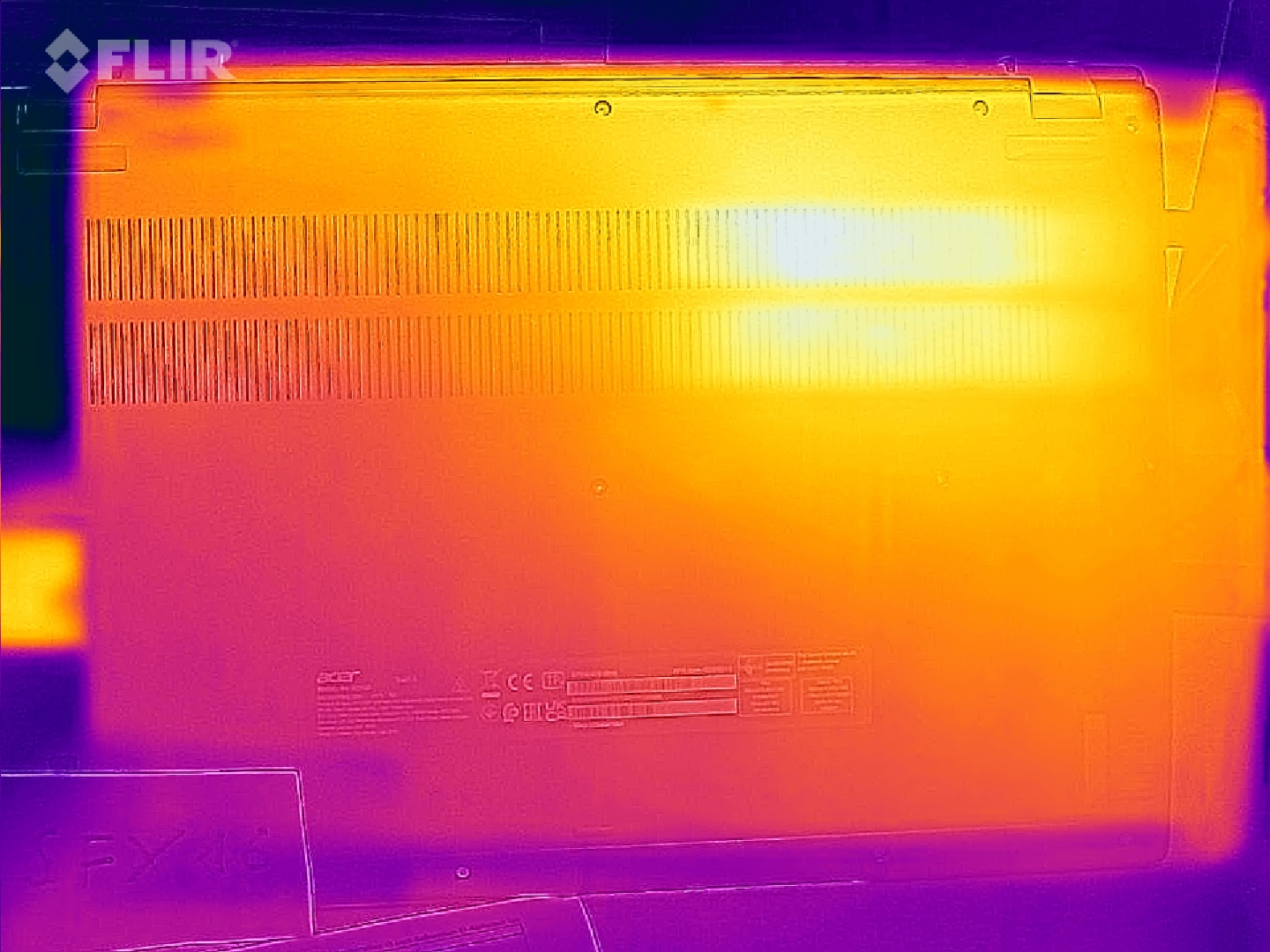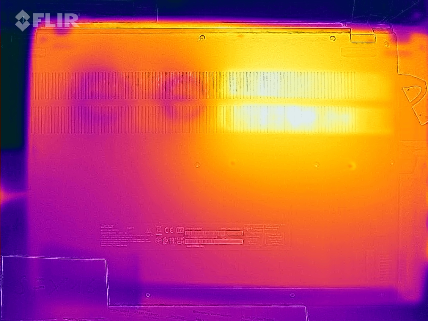 Selbst bei einfachen Aufgaben erwärmt sich das Acer Swift X SFX16 ein wenig. Die Tastatur fühlt sich relativ schnell warm an. Unter Last steigt die Temperatur und erreicht im Bereich des Doppellüfters mehr als 50 °C. Auf dem Wärmebild der Ober- und Unterseite ist die Position des Lüfters entsprechend gut auszumachen. Dies trifft aber nur in Extremsituationen zu. Bei Witcher 3, welches den Laptop ebenfalls an seine Grenze führt, werden lediglich 43 °C erreicht.