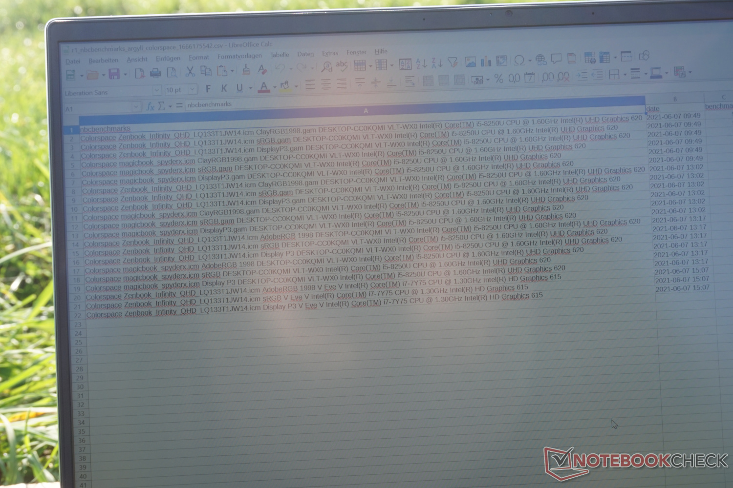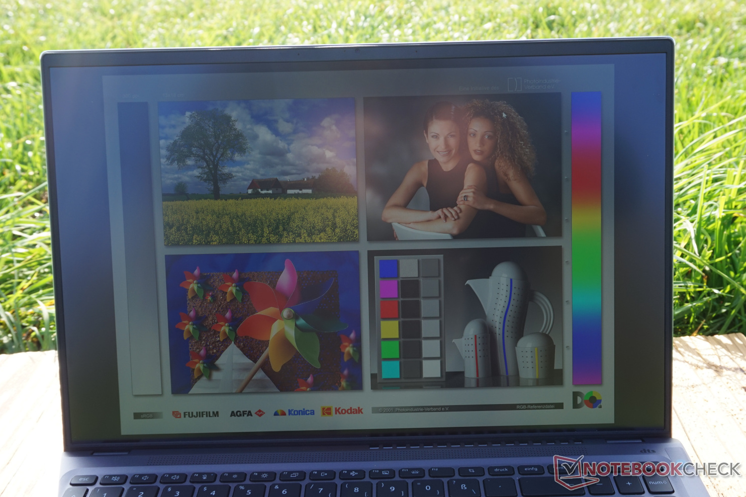 Die ordentliche Bildschirmhelligkeit reicht noch nicht, um den Laptop auch im Sonnenlicht zu verwenden. Eine Ursache findet sich in der recht deutlichen Reduzierung der Helligkeit von 400 auf 300 cd/m². Gegen die Sonne ist der Inhalt dennoch recht gut zu erkennen. Auch die Farben wirken dann weder blass noch verfälscht. Wer an einem schattigen Platz im Freien arbeiten will, sollte keine Probleme bekommen.