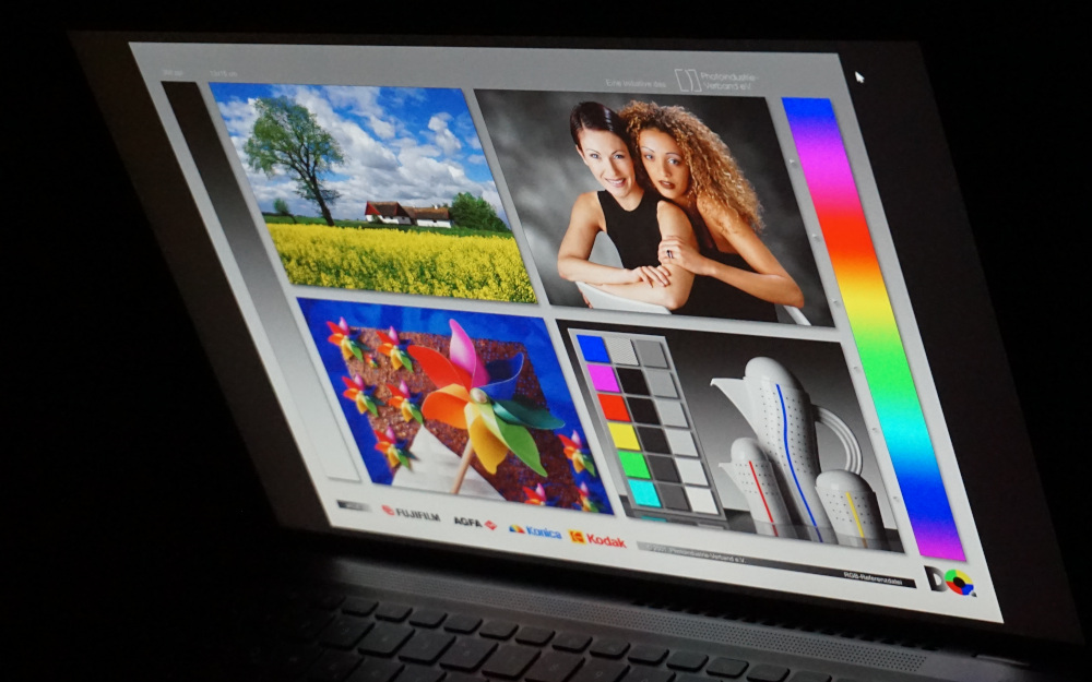 Der matte Bildschirm bietet mit 2.560 mal 1.600 Pixeln eine stimmige Auflösung, die unter anderem bestens für die Bearbeitung von Digitalfotos geeignet ist. Für das normale Lesen, Schreiben, Surfen sollte dagegen die empfohlene Vergrößerung von 150 % eingehalten werden, da sonst kaum etwas zu erkennen sein wird. Ebenfalls auf Mediengestaltung ausgerichtet ist das Format 16:10. So bleibt ober- und unterhalb von typischen 16:9-Aufnahmen noch Platz für Schaltflächen.