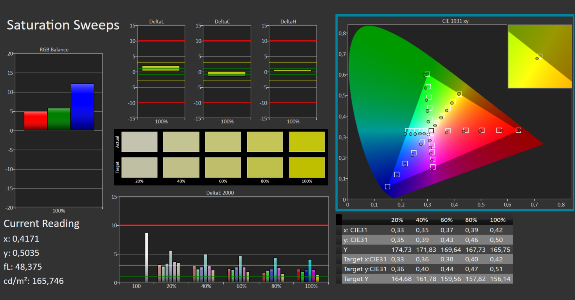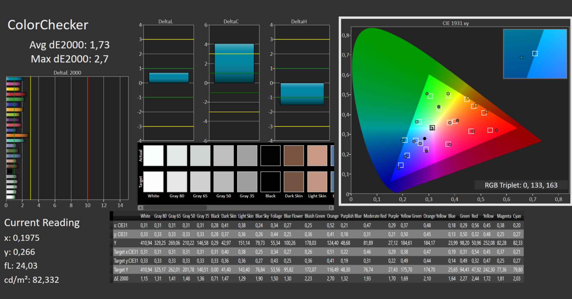 Bereits das original ausgelieferte Display zeigt kaum Farbabweichungen. Das gemessene DeltaE von maximal 2,7 ist mit bloßem Auge nicht mehr wirklich festzustellen. Eine Kalibrierung senkt diesen Wert sogar auf unter 2. Somit fällt die Beurteilung zur Farbdarstellung hervorragend aus. Das zugehörige Profil kann unterhalb des Feldes mit den Displaywerten heruntergeladen werden.