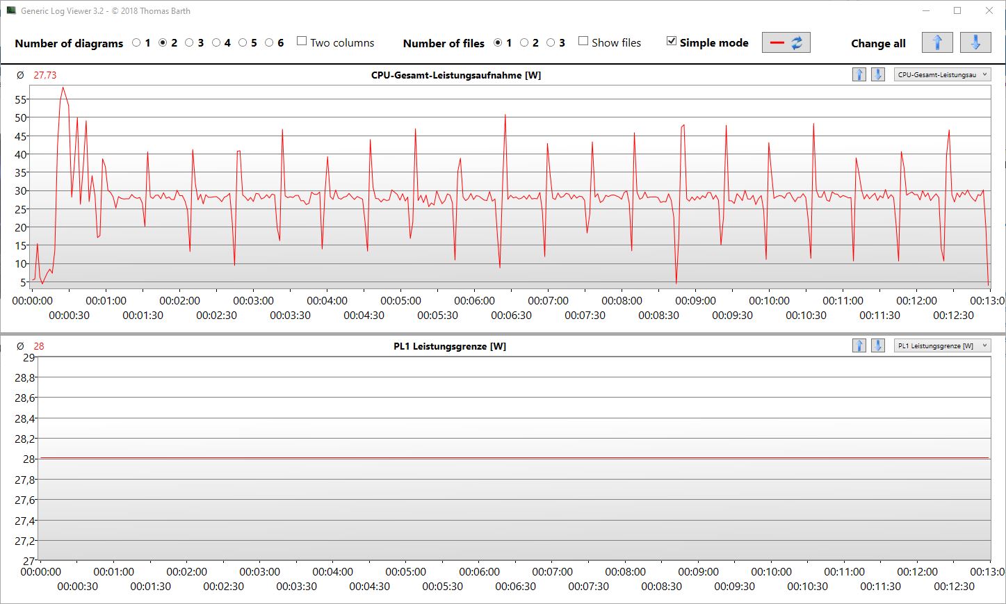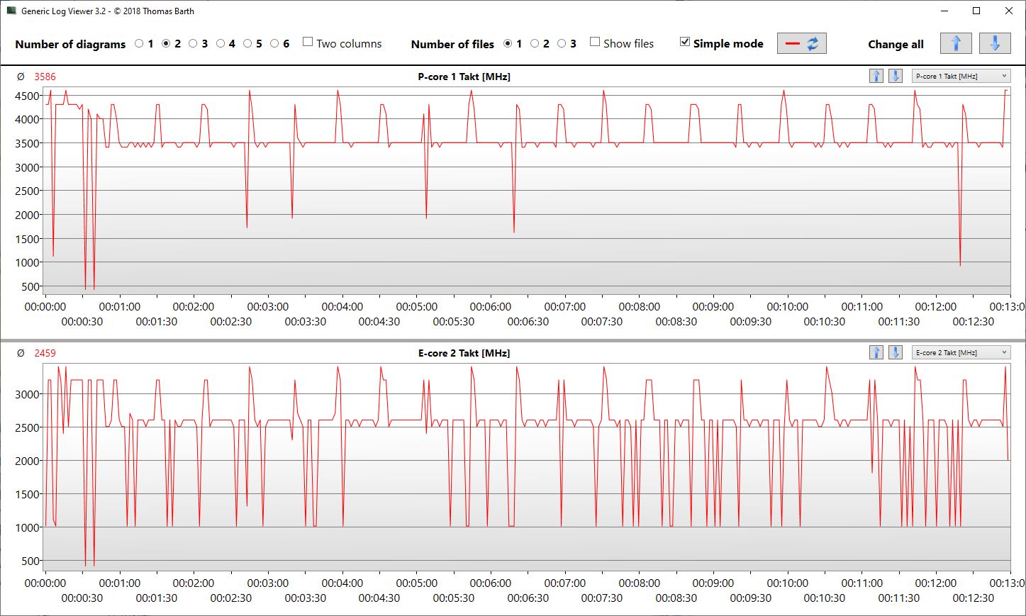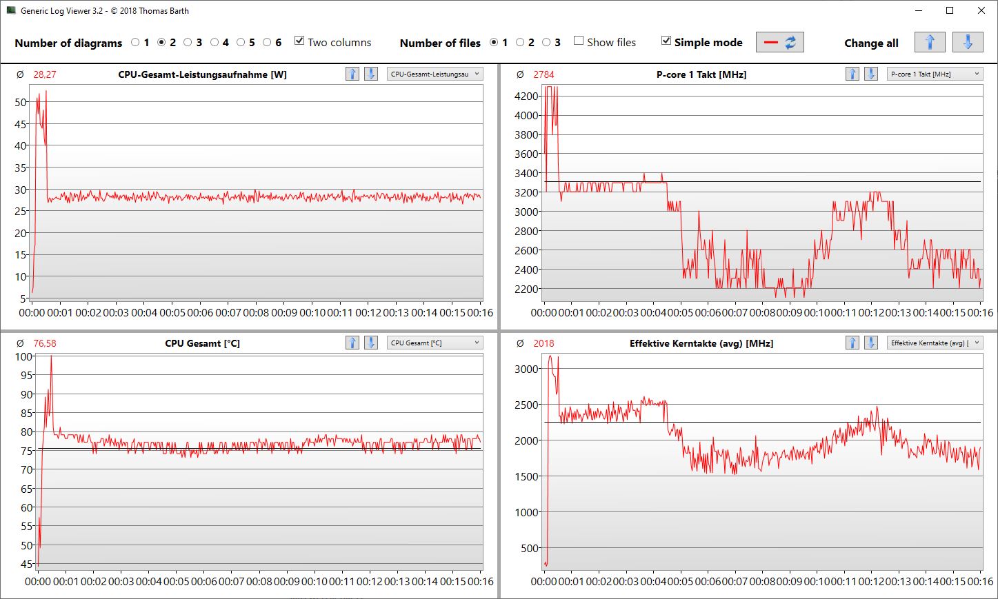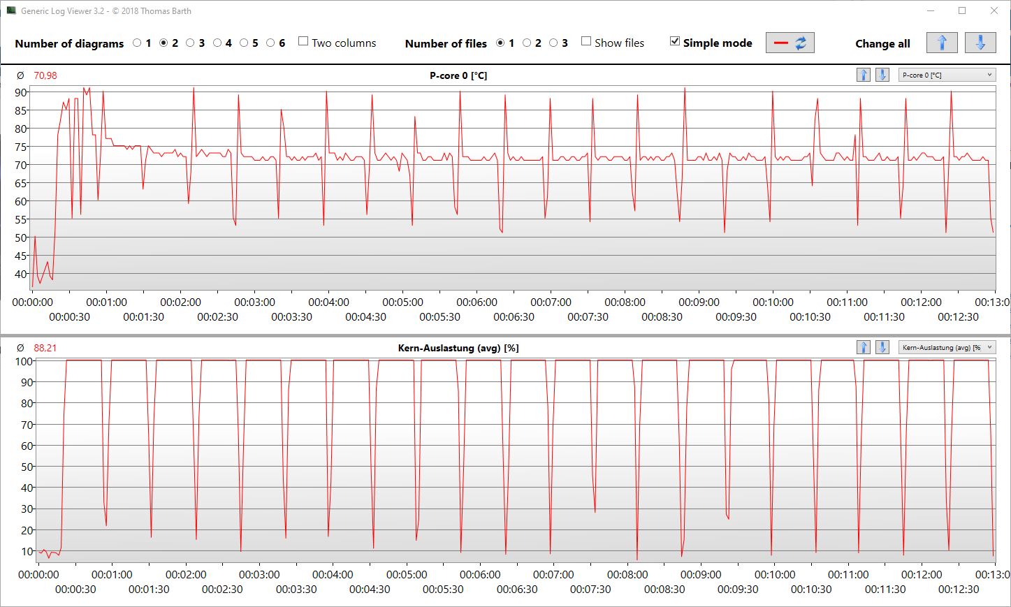 Den klassischen Stresstest absolviert das Travelmate P4 mit anfänglich hoher Leistungsaufnahme von 50 Watt, die aber bereits nach einer Minute auf 28 Watt drosselt und dann konstant bleibt. Die P-Cores ackern kurz mit 4,4 GHz, drosseln dann auf 3,3 GHz, um nach vier Minuten auf schwankend 2,4 bis 3,0 GHz zurückzusetzen. Bei diesem Szenario haben wir obige Maximaltemperaturen gemessen.