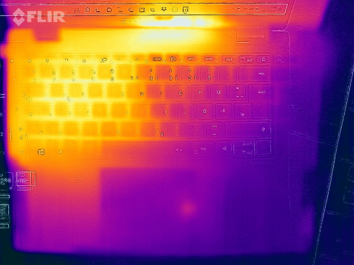 Das Notebook erwärmt sich nicht sonderlich stark. Während des Stresstests wird an zwei Messpunkten eine Temperatur jenseits von 40 Grad Celsius registriert. Im Alltagsbetrieb (Office, Internet) bewegen sich die Werte im grünen Bereich.