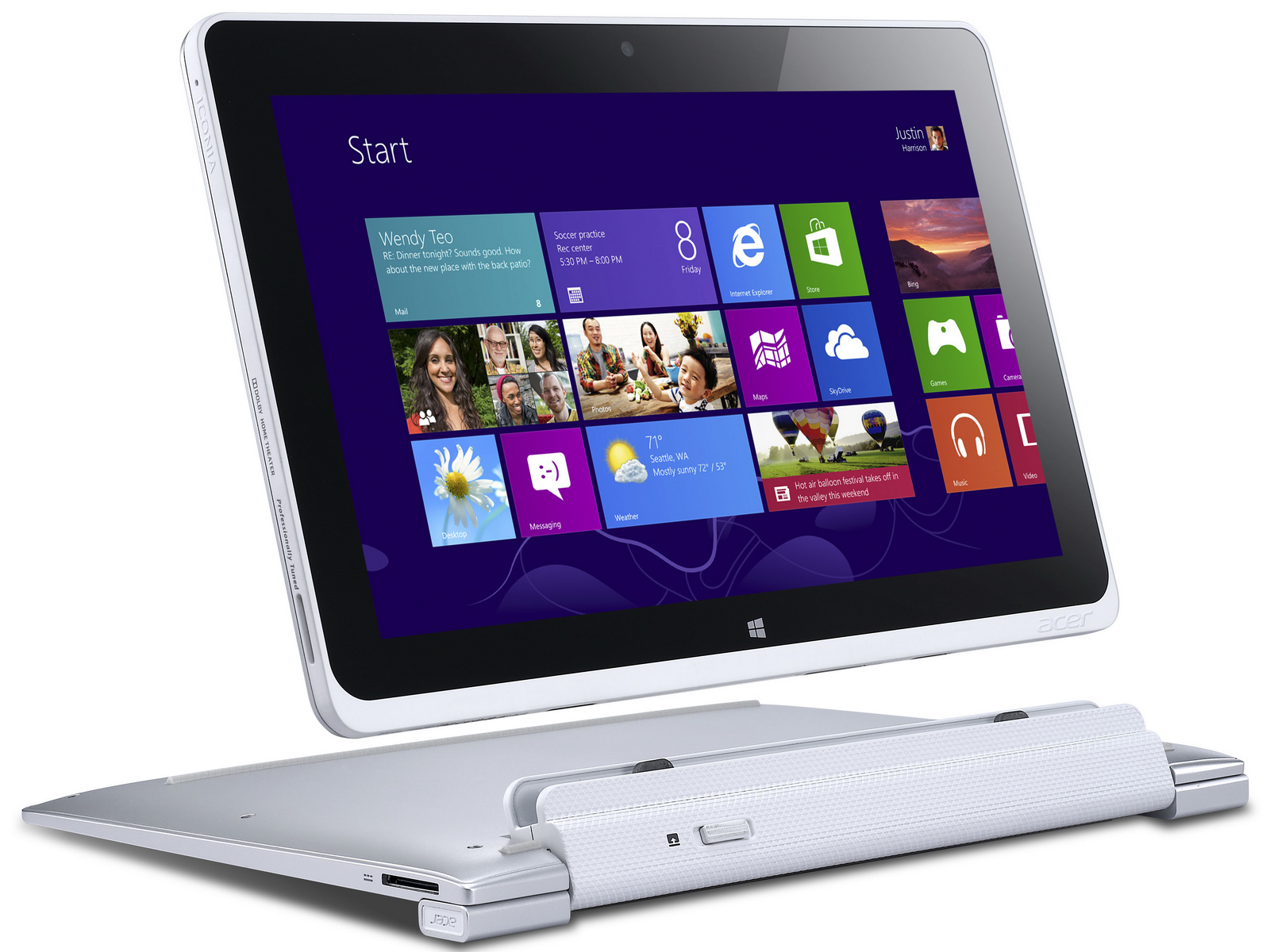 Das Acer Iconia W510 lässt sich dank 3 verschiedener Bedienmöglichkeiten als "Touch" wie ein klassisches Tablet, im Produktivitätsmodus "Type" mit Verwendung des Keydocks und mit umgeklapptem Keydock als Präsentationsfläche "View" multifunktional nutzen. Das Tablet kann auf der abnehmbaren Tastatur um 295 Grad geneigt werden und erlaubt damit auch mehreren Personen einer Präsentation zu folgen.