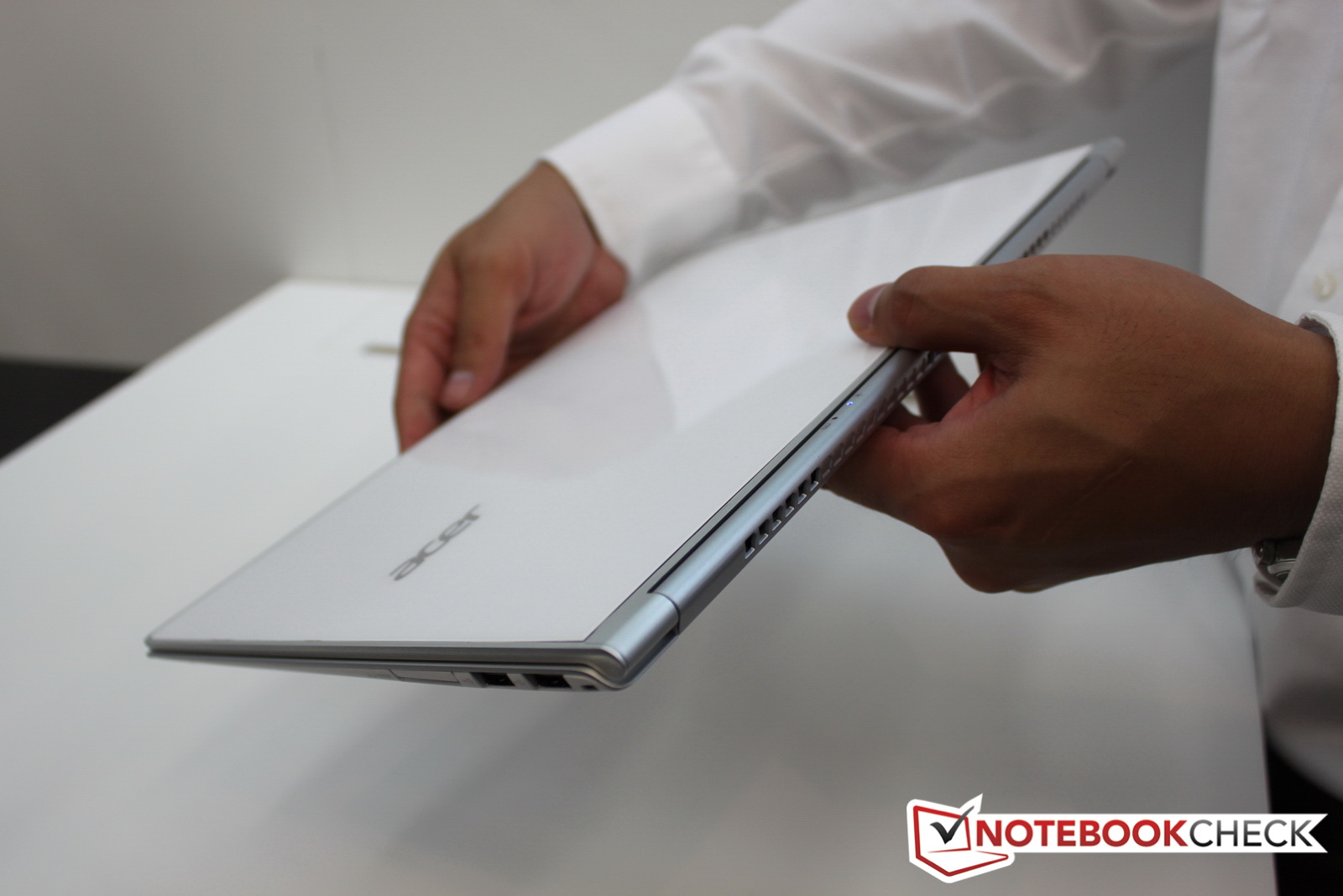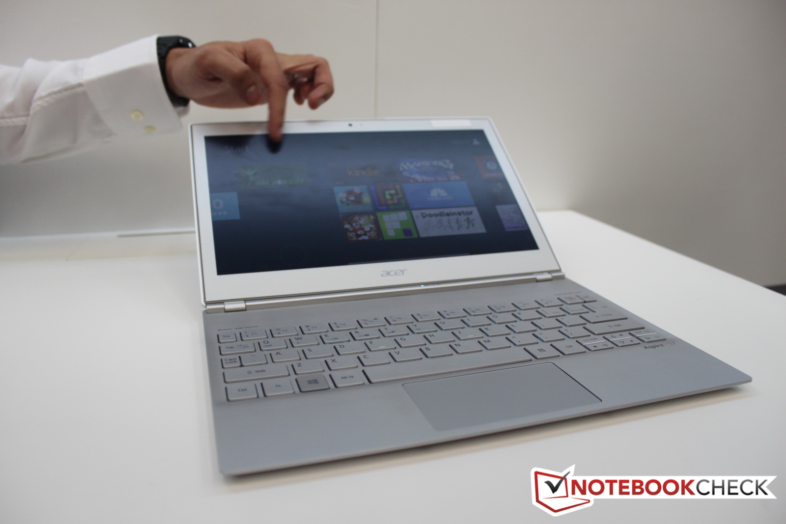 Seinem Aspire S7 mit 13,3 Zoll spendiert Acer auf der Deckelrückseite eine Glasoberfläche. Das Gewicht beträgt rund 1,2 bis 1,3 Kilogramm. Die Akkulaufzeit beziffert Acer mit bis zu 12 Stunden. Das spezielle Design mit einer besonderen Gewichtsverteilung und speziellen Scharnieren soll das Kippen bei der Touch-Bedienung reduzieren. Als Massenspeicher kommen keine Festplatten sondern SSDs zum Einsatz. Ausstattung und Preise will Acer zum Marktstart von Windows 8 nennen. Die Preise dürften aber zwischen 900 und 1.800 US-Dollar liegen.