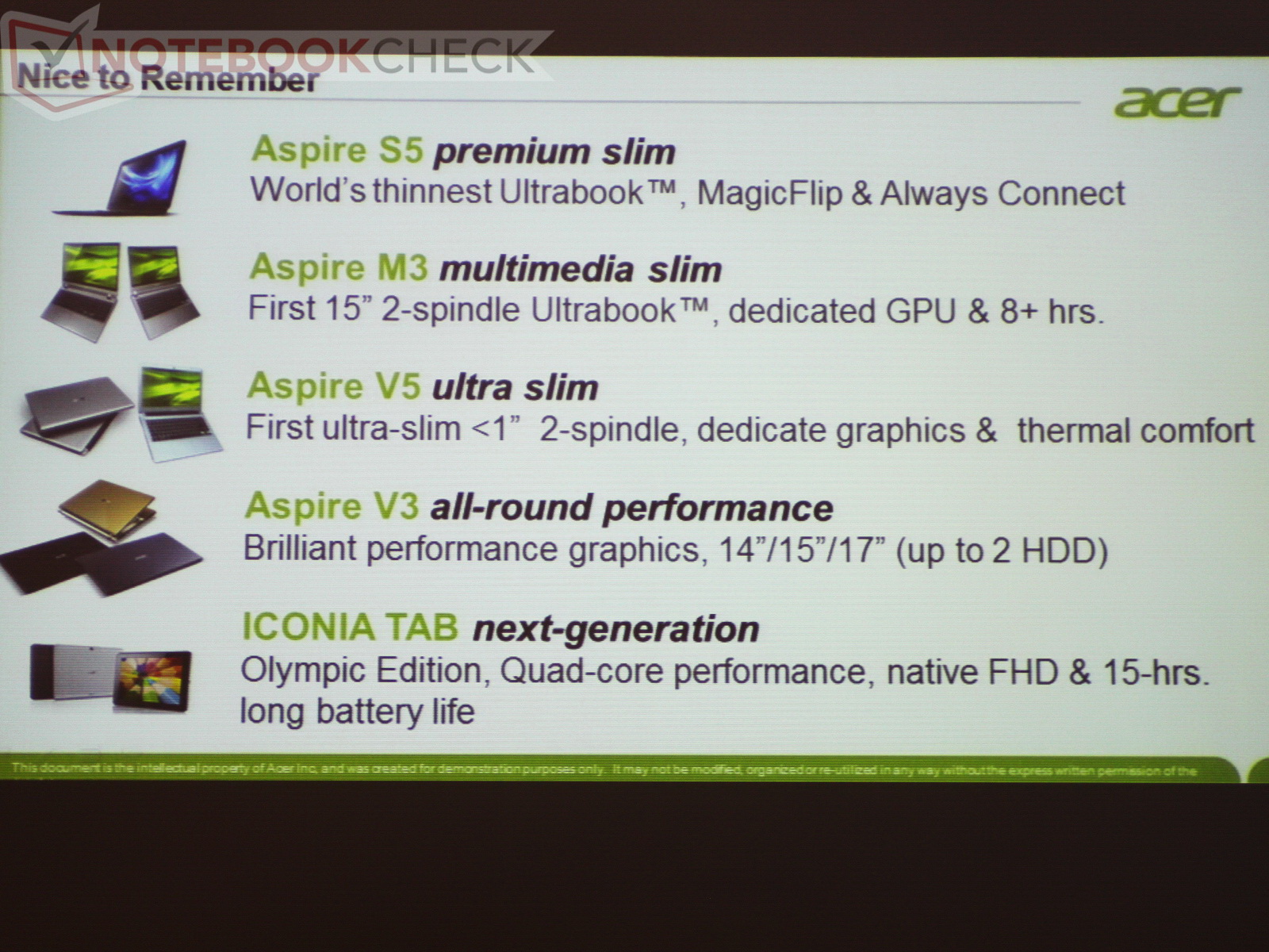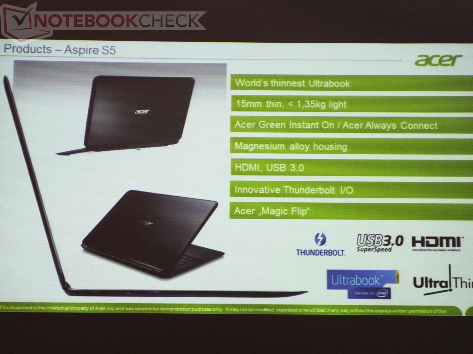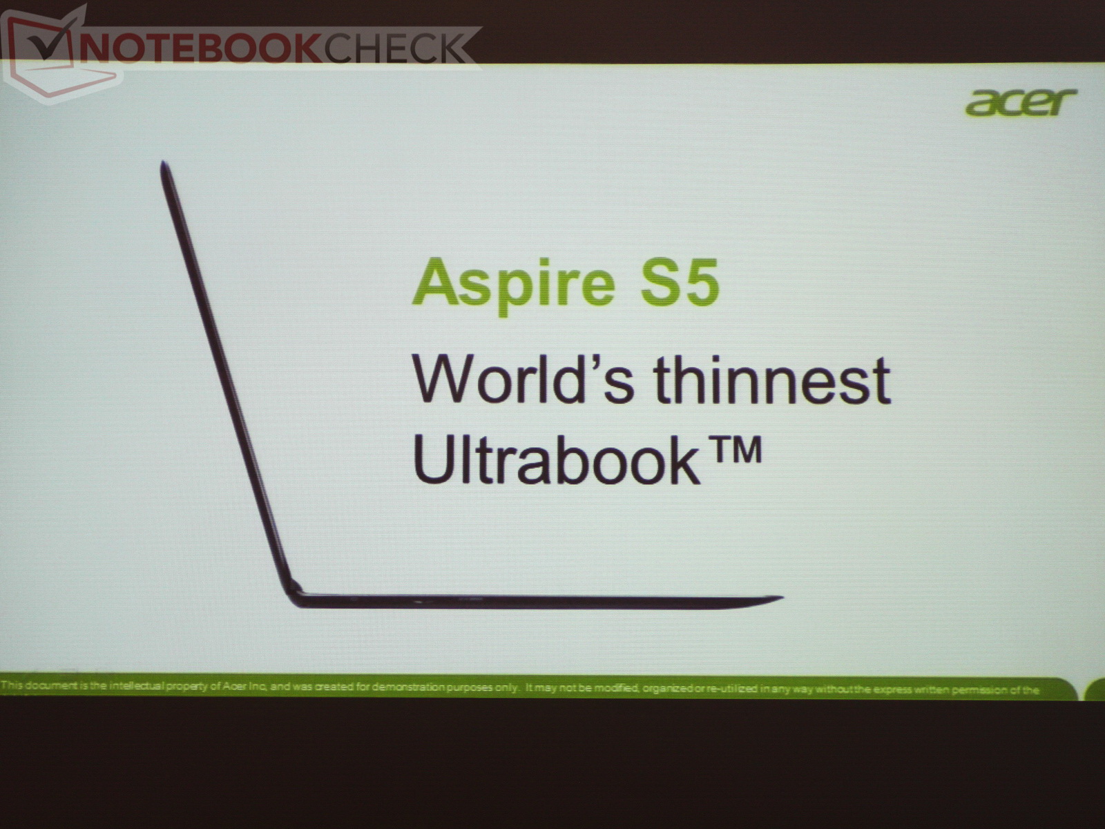 Wie Acer in seiner Pressekonferenz auf der CeBIT 2012 erklärte, setzt das taiwanische Computer- und Unterhaltungselektronikunternehmen in diesem Jahr neben Tablets voll auf Ultrabooks und Ultraslims. Ganz oben im Premium-Marktsegment bringt Acer in diesem Jahr neben dem überarbeiteten Aspire S3 mit Intels neuen Prozessoren der Generation "Ivy Bridge" auch das laut Acer derzeit weltweit dünnste Ultrabook Aspire S5.