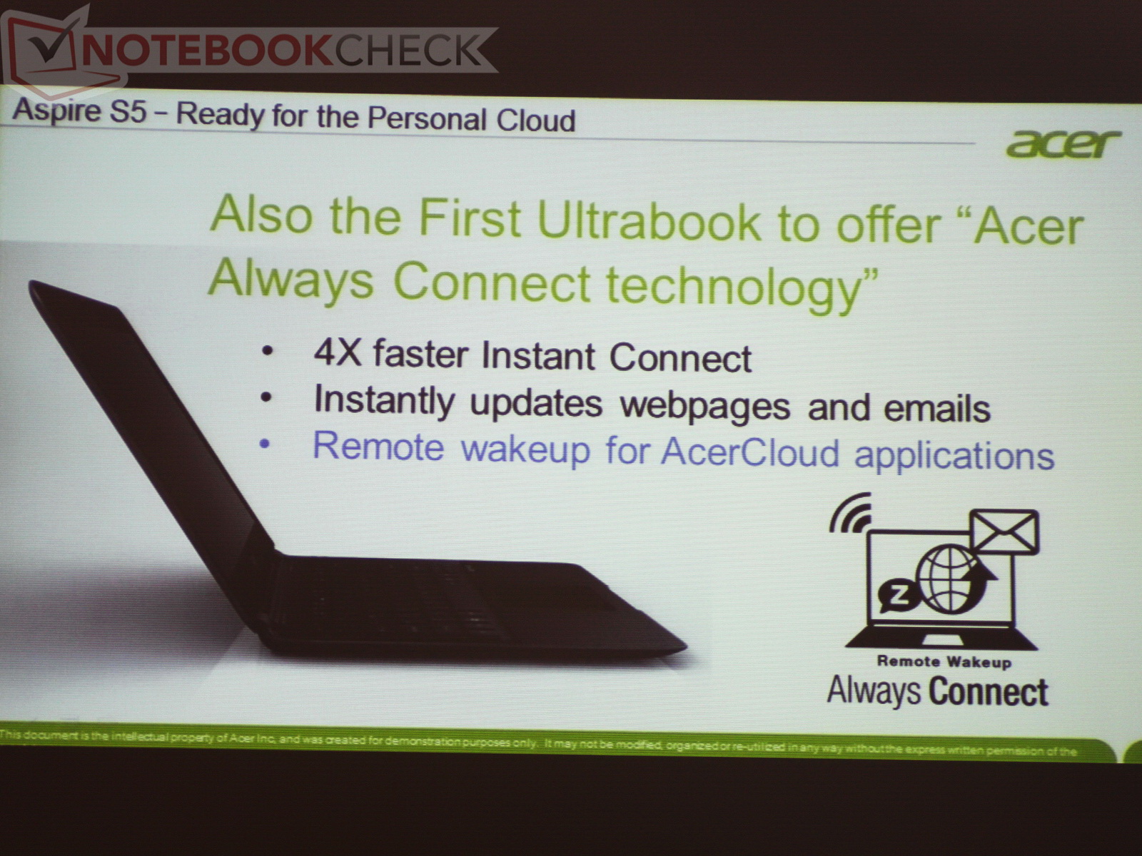 Bereits zur CES 2012 präsentierte Acer sein neues Premium-Ultrabook Aspire S5 mit klappbarer Schnittstellenleiste namens "MagicFlip I/O" und schnellem Thunderbolt. Das Aspire S5 bringt lediglich 1,35 Kilogramm auf die Waage und bleibt mit einer Bauhöhe von 15 Millimetern für ein Notebook erstaunlich flach. Das hochwertige Chassis besteht aus einer Magnesiumslegierung und integriert neben MagicFlip I/O, Thunderbolt auch HDMI und USB 3.0. Zudem ist das Aspire S5 das erste Ultrabook von Acer, das "Acers Always Connect Technology" an Bord hat, mit dem sich das Notebook bis zu 4-mal schneller mit dem Internet verbinden soll.