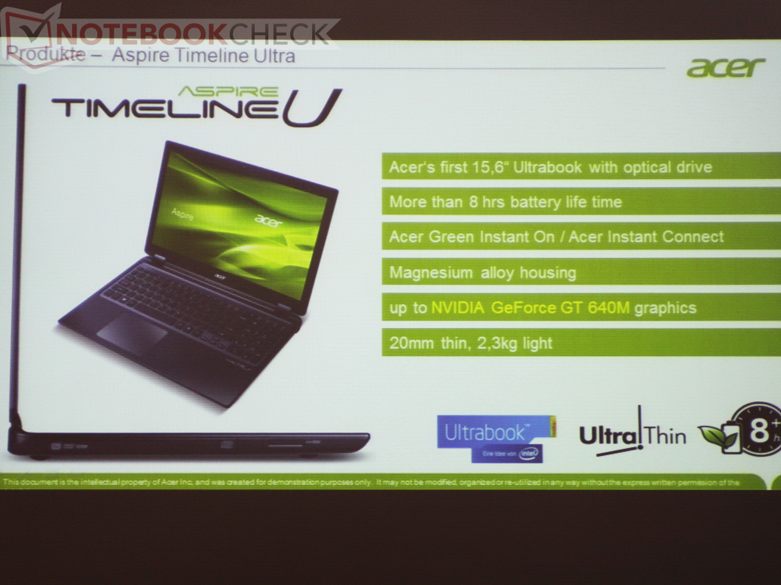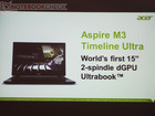 Mit dem Aspire M3 Timeline Ultra präsentiert Acer das nach eigenen Aussagen erste 15,6-Zoll-Ultrabook, das mit zwei physikalischen Laufwerken als Massenspeicher und einer diskreten Grafiklösung (dGPU) ausgerüstet ist. Das 15,6-Zoll-Ultrabook M3 Timeline Ultra wiegt 2,3 Kilogramm und integriert bei einer Bauhöhe von 20 Millimetern in seinem Magnesium-Chassis sowohl ein optisches Laufwerk als auch eine, der von Nvidia noch nicht offiziell angekündigten neuen 600er Grafiklösungen.