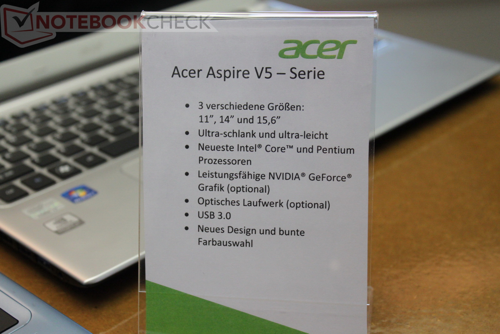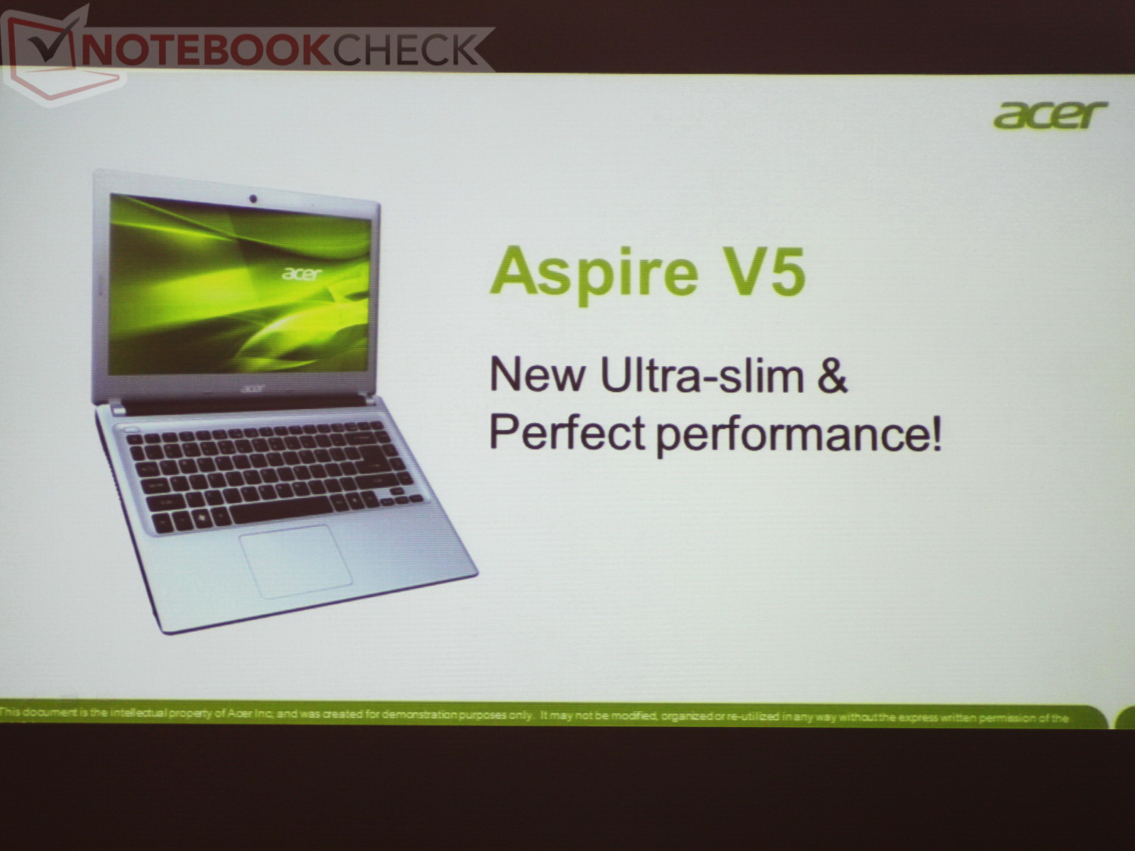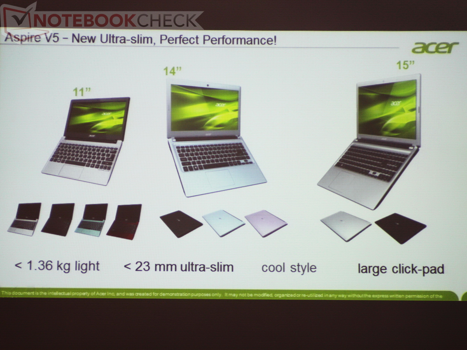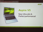 Seine beiden neuen Notebookserien Aspire V3 und V5 gehören für Acer in die Klasse der "Ultraslims", also Notebooks die zwar nicht alle strengen Auflagen seitens Intel für Ultrabooks erfüllen, aber trotzdem hinsichtlich Bauhöhe, Gewicht und Energieverbrauch auf einen hohen Mobilitätsfaktor hin optimiert sind. Die Serie Aspire V5 ist mit Bildschirmdiagonalen von 11,6 bis 15,6 Zoll erhältlich und soll unter 1,36 Kilo bleiben und weniger als 23 Millimeter in der Höhe messen.