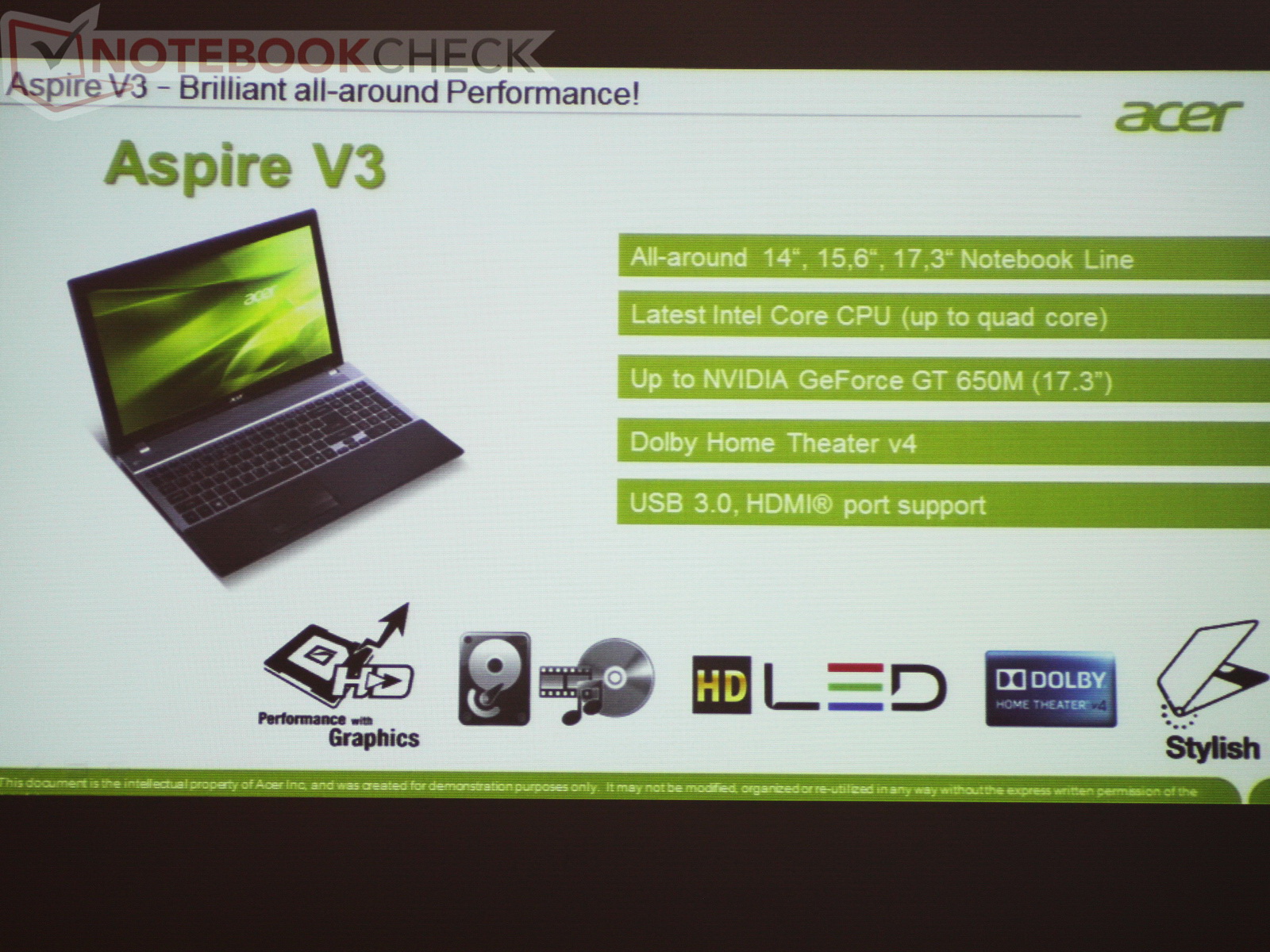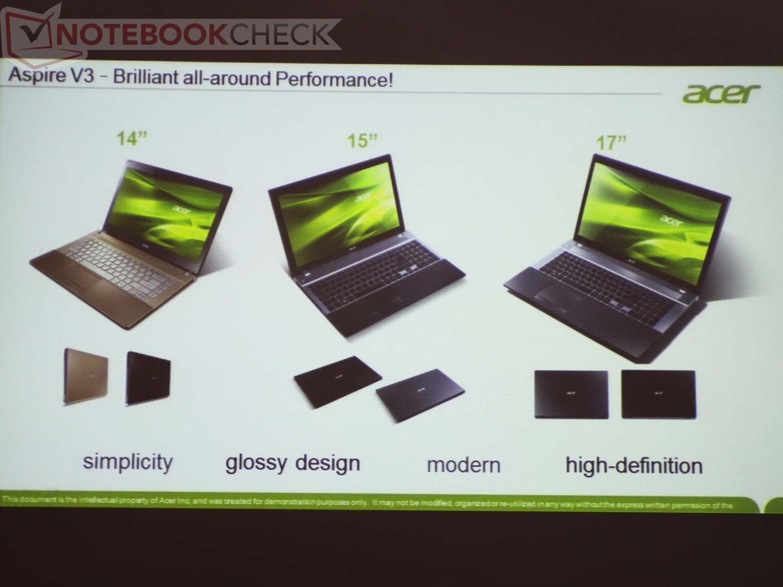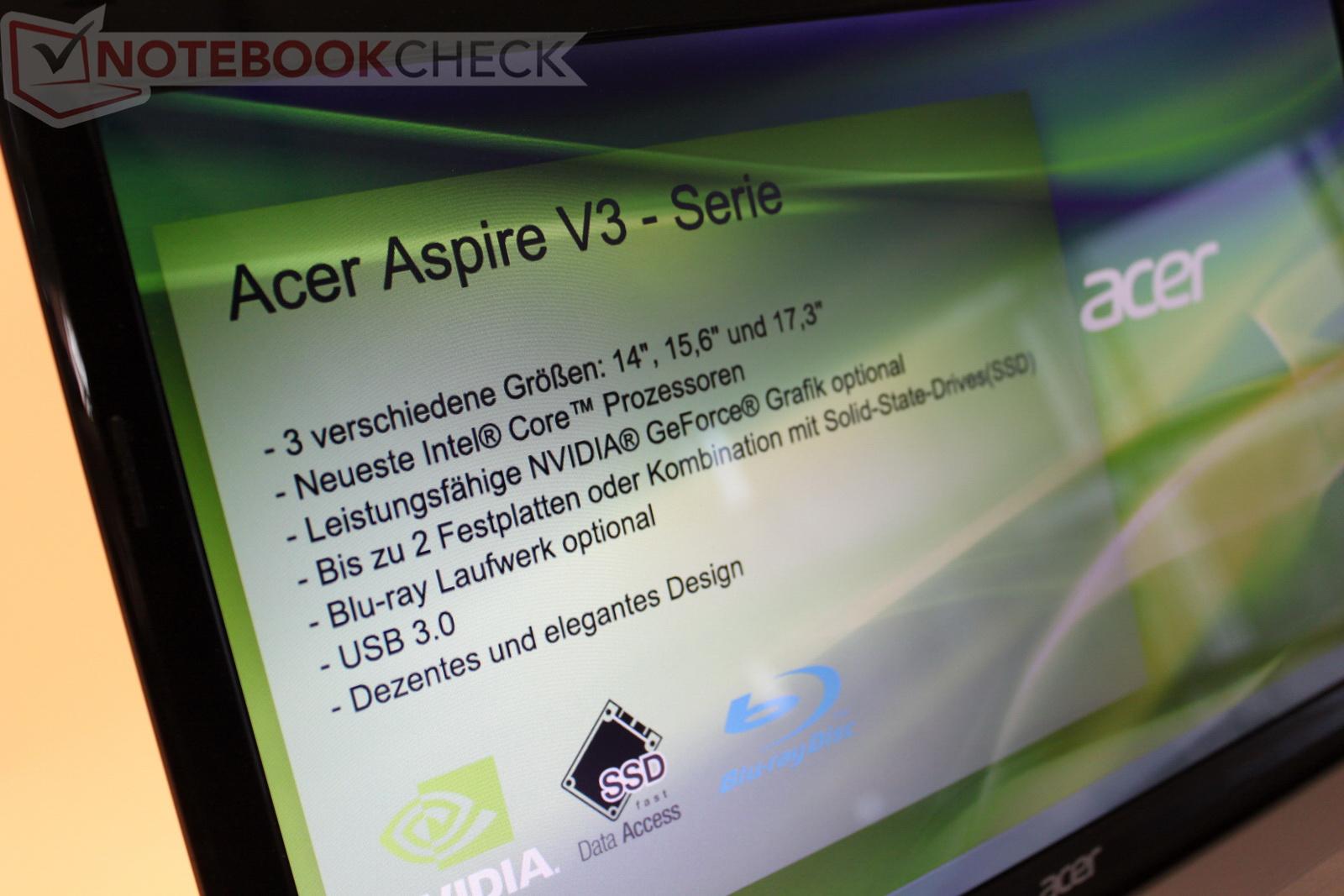 Die Allrounder-Notebooks von Acers Serie Aspire V3 decken den Bereich von 14 bis 17,3 Zoll ab und haben neben Intels neuesten Core-CPUs (bis zu Quad-Core) auch Nvidias neueste Grafiklösungen der kommenden 600-Serie an Bord. Auch hier steht hinsichtlich der GPUs aber eine offizielle Ankündigung seitens Nvidia noch aus.