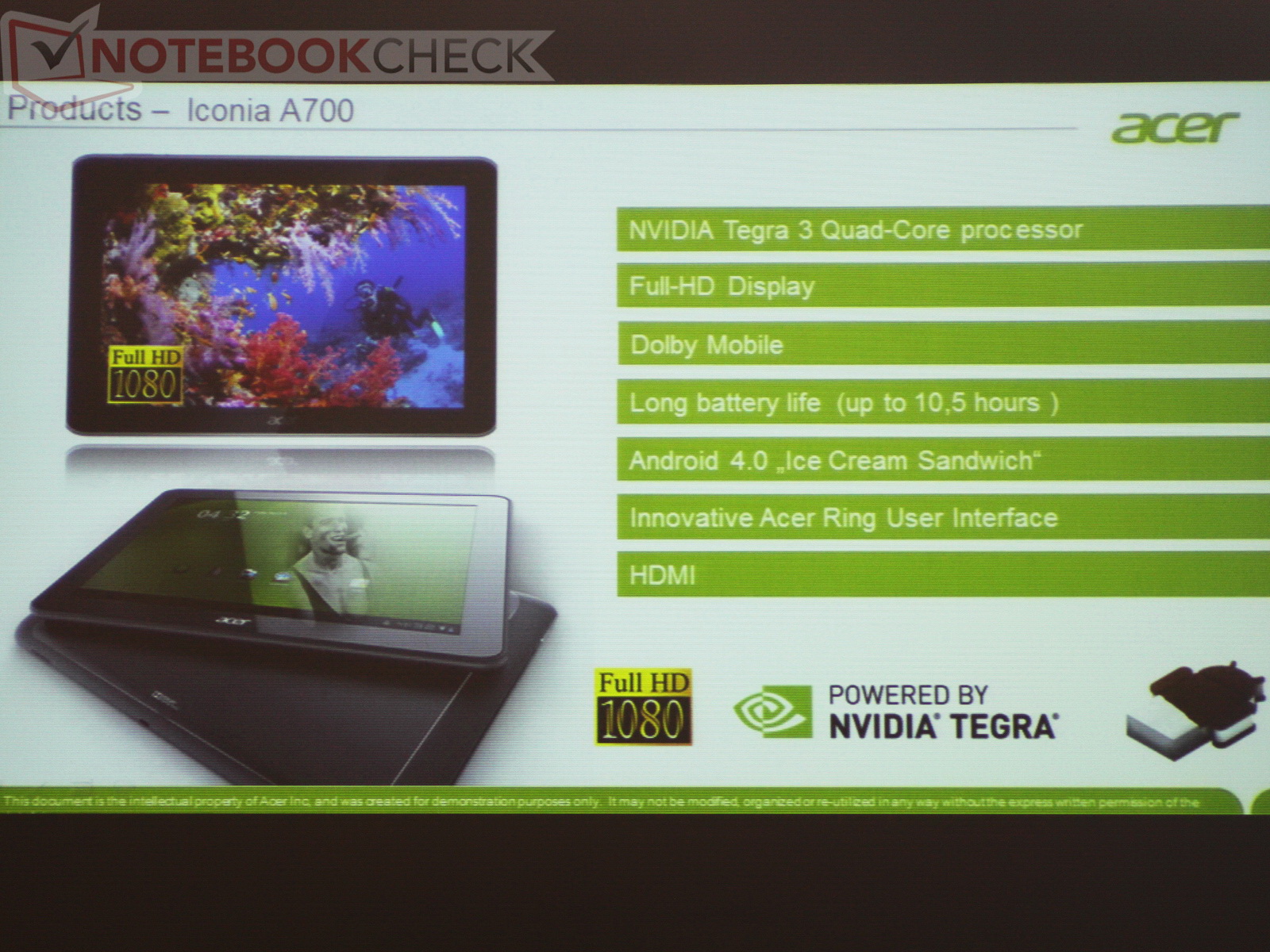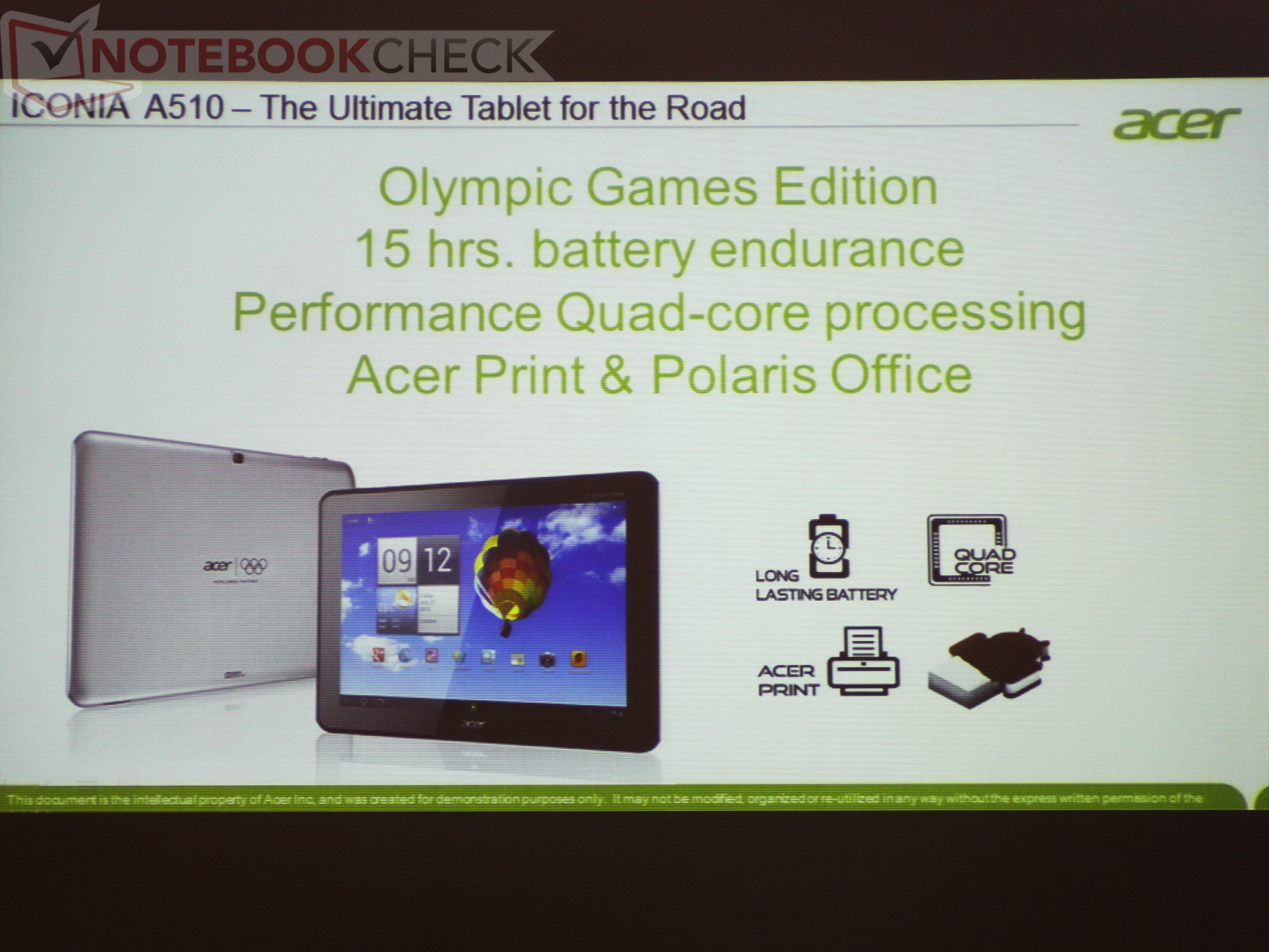 Im Bereich der Tablets hat Acer das Iconia A700 mit Full-HD-Display, Tegra 3 Quad-Core-SoC und Android 4.0 Ice Cream Sandwich ebenso bestätigt, wie das Iconia A510 in der "Olympic Games Edition" mit einer Akkulaufzeit von bis zu 15 Stunden.