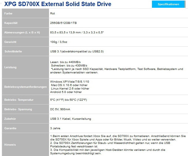 Die externe SSD XPG SD700X verfügt über 3D-TLC-NAND mit Speichergrößen von 256 GB, 512 GB oder 1 TB und ist nach IP68 staub- und wasserdicht. Die SD700X arbeitet Plug & Play über USB 3.1 mit Windows, Xbox One, PS4 und Android-Geräten. Adata nennt für die SD700X Lese- und Schreibgeschwindigkeiten von bis zu 440/430 MB/s. Zur Steigerung der Performance der 3D-TLC-NAND basierten SD700X kommt wie bei anderen SSDs dieser Bauart DRAM-Cache und SLC-Caching zum Einsatz.