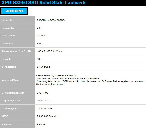 Die interne XPG SX950 SSD verwendet im Gegensatz zur SD700X "langlebigeres" 3D-MLC-NAND und einen SMI-Controller. Bei den Kapazitäten stehen Versionen mit 240 GB, 480 GB und 960 GB Speicherumfang zur Auswahl. Adata verspricht für die SSD SX950 bis zu 560 MB/s beim Lesen und 530 MB/s bei Schreibvorgängen. Auch die SX950 verfügt über SLC-Cache und DRAM-Cache-Puffer, um die Performance über einen weiten Anwendungsbereich hoch zu halten. Desktop-Anwender können sich entscheiden, ob sie die mitgelieferte 3,5-Zoll-Halterung und den Installationssatz verwenden. Qualität: Adata gewährt auf die SX950 eine 6-jährigen Garantie.