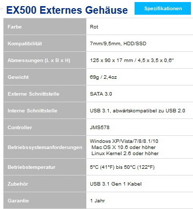 Das EX500 ist für alle SSDs und HDDs im 2,5-Zoll-Formfaktor geeignet und bietet Gamern ein auffälliges Gehäuse mit schnittig-aggressiver Optik. Dank der werkzeuglosen Installation, der sicheren Verriegelung und der stoßfesten Konstruktion des externen Laufwerksgehäuses eignet sich das EX500 auch ideal fürs Gaming unterwegs: Das EX500 nutzt einen JMicron JMS578 als Controller und ist über USB 3.1 "Plug and Game"-kompatibel mit PS4, Xbox One und PC.