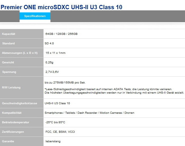 Die ebenfalls MLC basierten Modelle der microSDXC-Serie Premier One UHS-II U3 Class 10 liegen bei bis zu 275 MB/s Lesen und 155 MB/s Schreiben. Sowohl die microSD- als auch die SD-Kartenmodelle unterstützen V90-Video-Geschwindigkeiten respektive 90 MB/s RAW-Video-Aufzeichnung für die Erfassung von 4K-, 8K- und VR-Inhalten ist. Auch Actioncams und 360-Grad-Live-Capture-Anwendungen profitieren von dieser Performance, da sie eine unkomprimierte Aufzeichnung ohne Verzögerung, Pufferung oder Reduzierung der Auflösung erlauben.