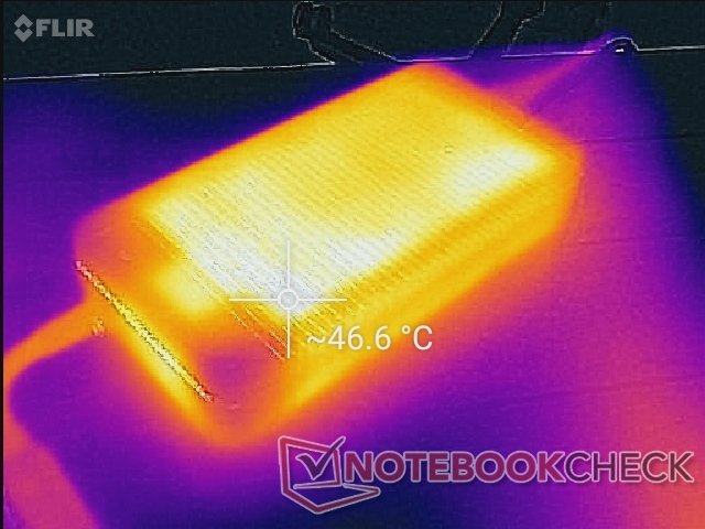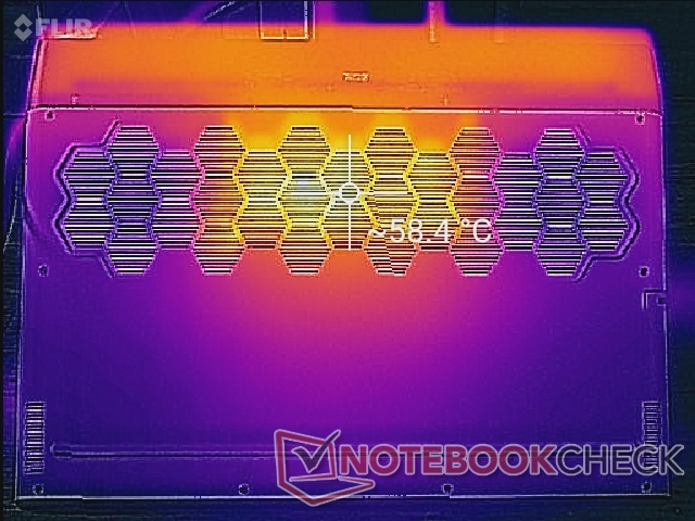 (-) Auf der Unterseite messen wir eine maximalen Wert von 58.4 °C (im Vergleich zum Durchschnitt von 43.3 °C).
