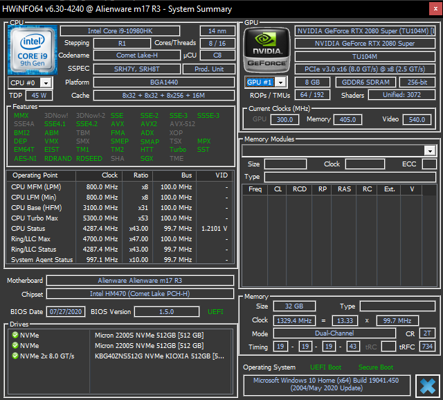 | 85.3 % v7 (old) | 09 / 2020 | Alienware m17 R3 P45E i9-10980HK, GeForce RTX 2080 Super Mobile | 3 kg | 20.7 mm | 17.30" | 1920x1080 | |