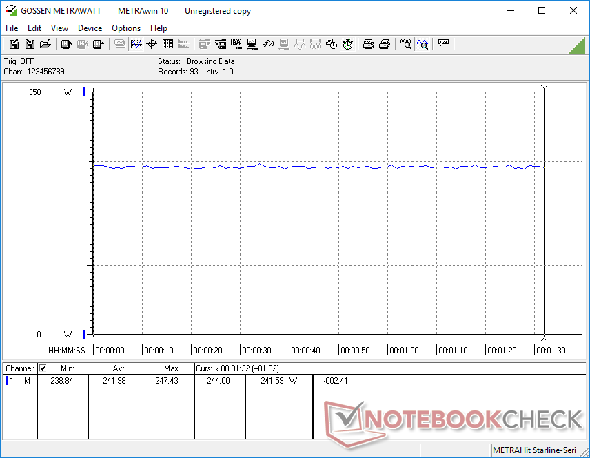 Im Systemleerlauf bei eingestelltem Energiesparmodus werden mindestens 33 W Strom gezogen, im Turbo-Modus gar 59 W. Andere 17,3-Zoll-Gamer verbrauchen hier die Hälfte! Der Verbrauch springt bei Witcher 3 sogar auf 242 W, ein nochmals höherer Wert als beim konkurrierenden Asus Strix Scar 17 G732LXS mit gleicher CPU und GPU. Der Energieverbrauch beim Gaming ist 30 Prozent höher als beim Alienware m17 R2, obwohl die Leistungssteigerung durch die mobile Geforce RTX 2080 Super gegenüber der Max-Q-Variante nur 15 Prozent beträgt!