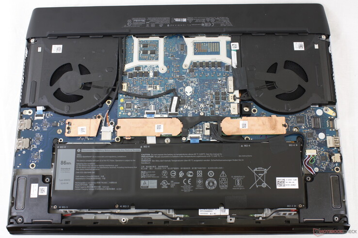 Das Gehäuse bleibt im Vergleich zum Alienware m17 R2 nahezu identisch, sodass alle unsere dortigen Anmerkungen auch auf das m17 R3 zutreffen. Ein spürbarer Unterschied betrifft das Gewicht des m17 R3, denn dieses ist rund 400 g schwerer (3 kg vs. 2,6 kg) ohne größer zu sein. Im Inneren dürfte die Hardware also recht gedrängt verbaut sein. Der Gewichtszuwachs dürfte vor allem durch das neue Dampfkammer-Kühlsystem zustande kommen, welches in der letzten Generation nicht verbaut war.