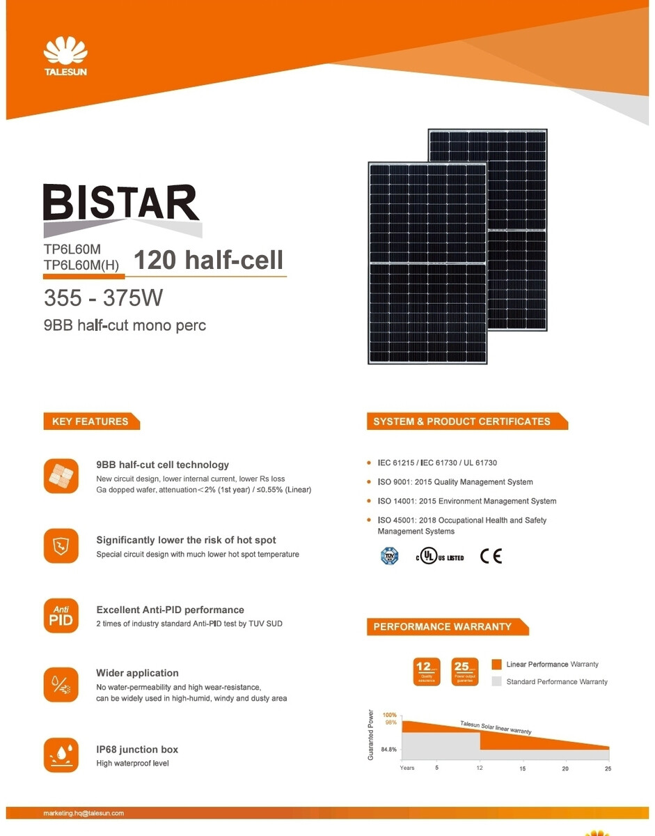 Unter den Solarpanels stehen alternativ die Glas-Folie-Module Talesun BiStar TP6L60M mit 375 Wp, 9BB, silbernem Rahmen und einem etwas schmaleren Maß von 1.755 x 1.038 x 35 Millimetern oder die Bluesun BSM-425Wp mit 425 Wp, schwarzem Rahmen und 10BB-Halfcut-Technologie zur Verfügung.