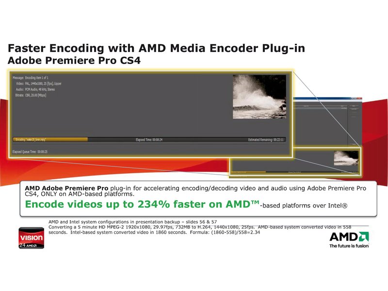 In der Leistungs-Oberklasse von VISION Ultimate kommen Profis mit dem AMD-Plugin für Adobes Highend-Videoapplikation Premiere Pro CS4 in den Genuss eines gewaltigen Geschwindigkeitsvorteils. Das Encoding und Decoding von Audio und Video wird auf AMD-basierten Plattformen im Vergleich zu den Intel-Pendants um bis zu 234 Prozent schneller.