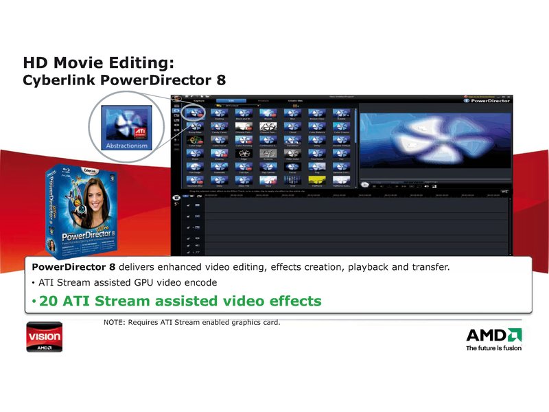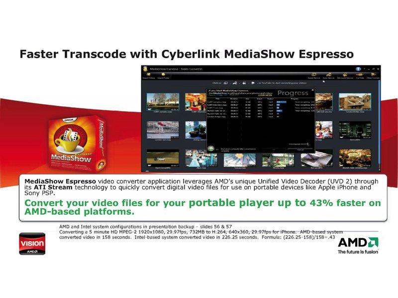 So nutzt der Videokonverter MediaShow Espresso AMDs einzigartigen Unified Video Decoder (UVD 2), um digitale Video-Dateien für den Gebrauch mit portablen Endgeräten wie Apples iPhone und Sonys PSP schnell umzuwandeln. Mit VISION Premium ist ein Plus an Geschwindigkeit von bis zu 43 Prozent bei der Video-Umwandlung möglich.