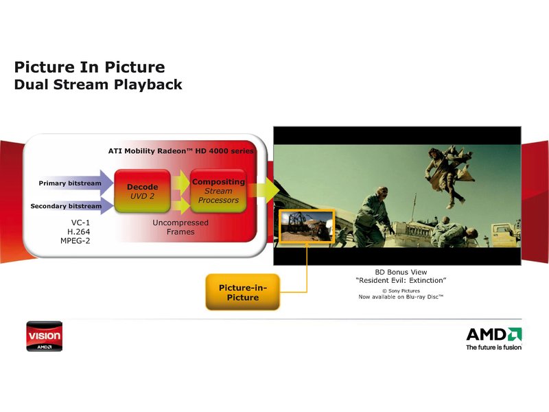 In der Premium-Klasse profitiert der Anwender von Highlights wie der vom Fernsehen her bekannten „Picture In Picture“- oder Bild-in-Bild-Technik. Zudem wird die Premium-Variante der VISION Technologie von AMD von bekannten Videoanwendungen wie Cyberlinks MediaShow Espresso und Sonys Movie Studio 9 Platinum unterstützt.