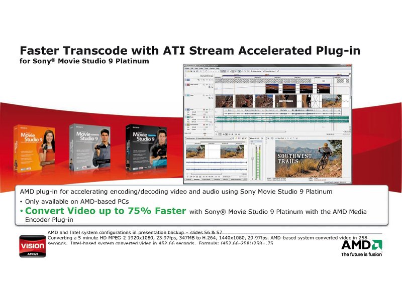 Auch für Sonys Movie Studio 9 Platinum ist ein spezielles Plugin für die Beschleunigung von Encoding- und Decoding-Operationen bei Audio- und Videoanwendungen erhältlich. Videos werden mit dem AMD Media Encoder Plugin um bis zu 75 Prozent beschleunigt.