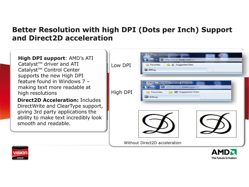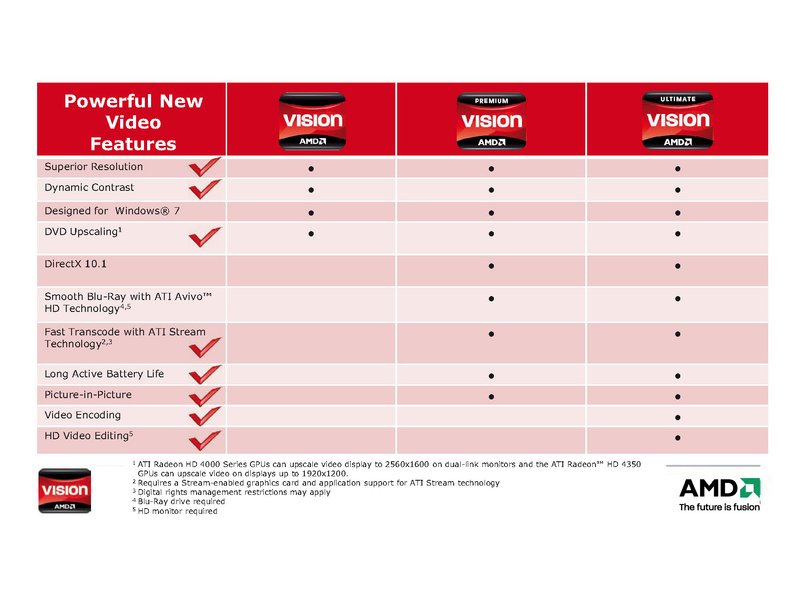 AMDs günstige Einsteigerklasse. Notebooks mit diesem Logo verfügen über eine komplette Basis-Ausstattung für alle Office-Arbeiten inklusive E-Mail. Geräte mit Label der VISION Technologie von AMD eignen sich auch zum Musikhören und um im Internet Fotos und Videoclips anzusehen. Als Prozessor kommt ein mobiler Athlon zum Einsatz, der von einer integrierten Chipsatzgrafik unterstützt wird. Die VISION Technologie von AMD unterstützt mit dem Catalyst Control Center und -Treibern das High-DPI-Feature von Microsofts Windows 7. Dank DirectWrite- und ClearType-Unterstützung bleibt damit Text auch bei höheren Bildschirmauflösungen bequem lesbar.