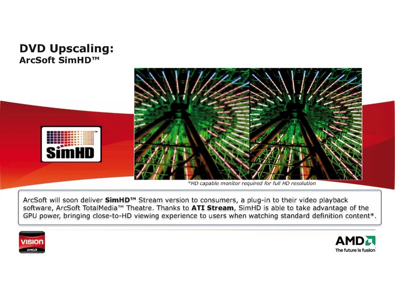 Auch ArcSoft unterstützt die VISION Technologie von AMD und bringt mit „SimHD“ein Stream-Plugin für seine Videosoftware ArcSoft TotalMedia Theatre. Dank ATIs „Stream-Technologie“ kann der Anwender mit SimHD die Leistung der Grafikkarte seines Vision-Rechners nutzen, um mittels DVD-Upscaling auch bei üblichen SD-Filmen ein hochauflösendes HD-Bilderlebnis zu erhalten.