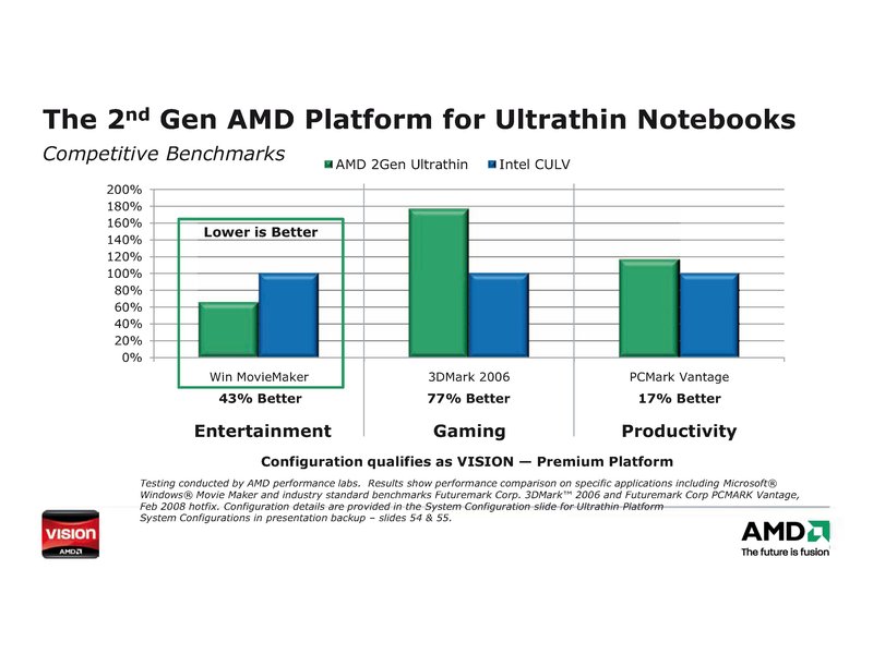 Die bisherige Logo-Kennzeichnung der Rechner war zu unübersichtlich und zu technisch. Dem Kunden sind viele Technikdetails schlicht unwichtig. Statt sich wie bisher in technischen Details verlieren zu müssen, kann sich der Anwender dank der VISION Technologie von AMD künftig voll auf seine Arbeit und die Unterhaltung mit seinem Rechner konzentrieren. Denn mit der VISION Technologie von AMD kann sich der Kunde sicher sein, dass auch im Bereich des Mobile-Computing aufeinander abgestimmte Prozessor- und Grafikeinheiten für ein ultimatives Unterhaltungserlebnis sorgen.