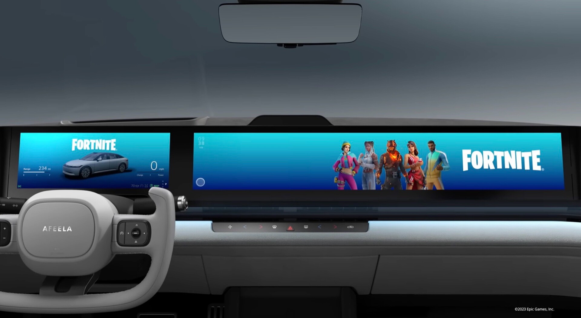 Eines der wohl ungewöhnlichsten Features ist die sogenannte "Media Bar", ein längliches Display an der Stoßstange, das unter anderem den Namen des Fahrzeugs, Warnsignale oder auch Geburtstags-Glückwünsche anzeigen kann. Die Displays im Fahrzeuginneren, die über beinahe die gesamte Breite von Afeela reichen, können Entertainment-Inhalte wie Filme oder Fortnite darstellen. Ungewöhnlich sind vor allem Sonys Augmented-Reality-Spiele.