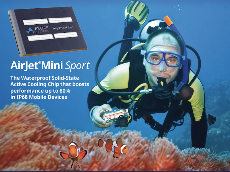 Frore System hat eine IP68-taugliche Variante seiner Membrankühlungslösung Airjet angekündigt. Mit dem Airjet Mini Sport kann ein Gerät, das eine aktive Kühlung hat, 30 Minuten in Wasser mit einer maximalen Tiefe von 1,5 Meter eingetaucht werden, ohne dass die Kühlung beschädigt wird.