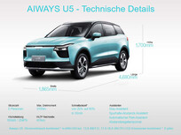 Der chinesische E-Auto-Hersteller Aiways bietet seinen Elektro-SUV Aiways U5 in der Standardversion inklusive Überführungs- und Zulassungskosten zu Preisen ab 35.993 Euro an, wobei hier die Hersteller-Umweltprämie bereits abgezogen ist. Das besser ausgestattete Premium-Modell des Aiways U5 kostet laut Liste 39.070 Euro. Interessenten bekommen den Aiways U5 in Deutschland direkt bei Aiways oder der Elektronikmarktkette Euronics. Den Service erledigt ATU.