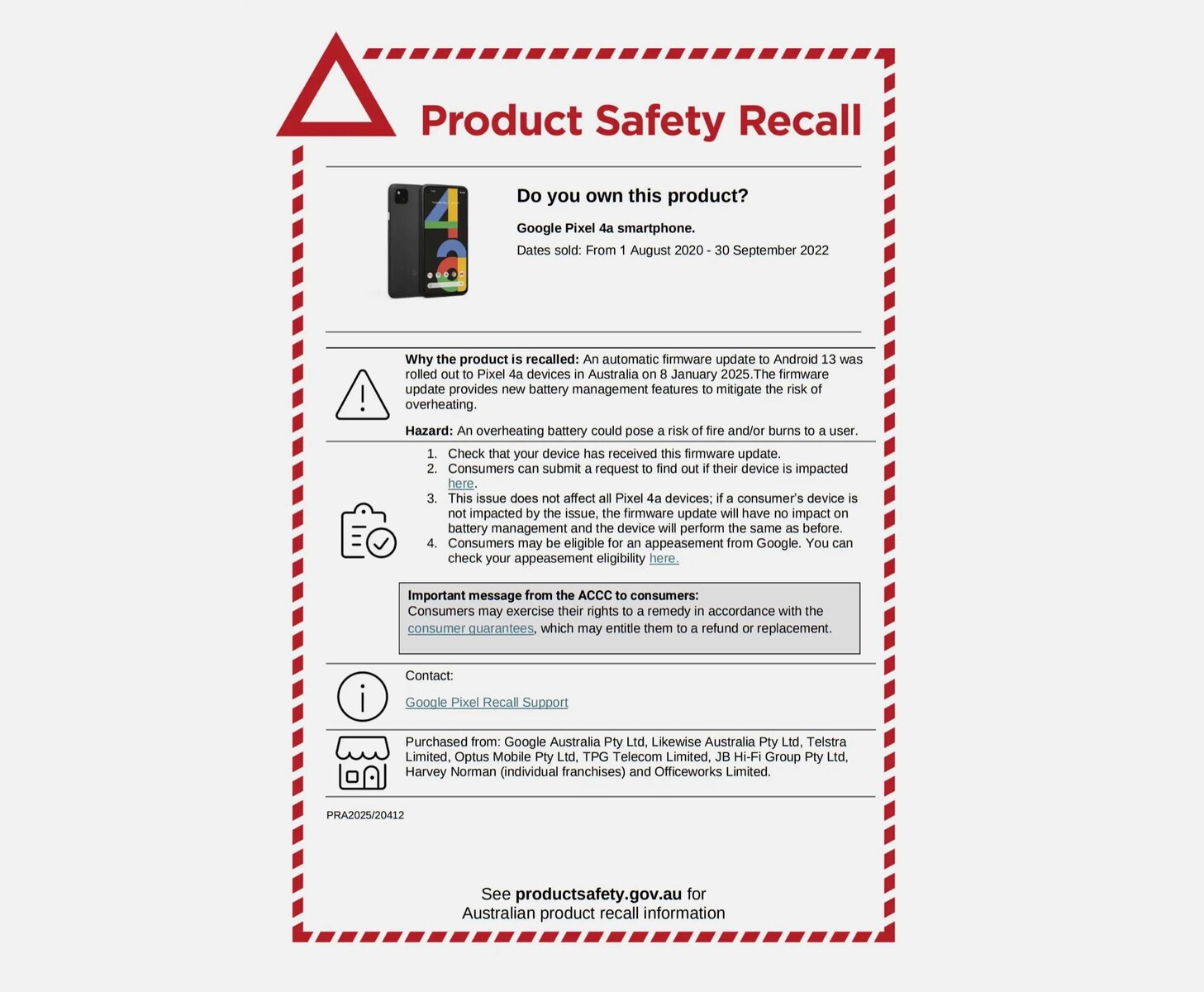 Diese Vorgehensweise hat bereits darauf gedeutet, dass Google ein Problem mit diesen speziellen Akkus festgestellt hat. Die "Product Safety"-Abteilung der Australian Competition & Consumer Commission (ACCC) liefert nun endlich Details zu diesem Update, das Google in Australien offenbar als Teil eines Produkt-Rückrufs verteilen musste. Demnach neigt der Akku des Pixel 4a dazu zu überhitzen, was zu einem Akku-Brand und somit zu Verbrennungen führen kann. Das Firmware-Update, welches die Leistung des Akkus deutlich reduziert, soll auch das Risiko eines Akku-Brandes reduzieren.