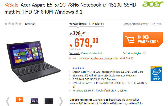 » ab 555 Euro bei Cyberport (Win 8, i5-4200U, 500GB SSHD)