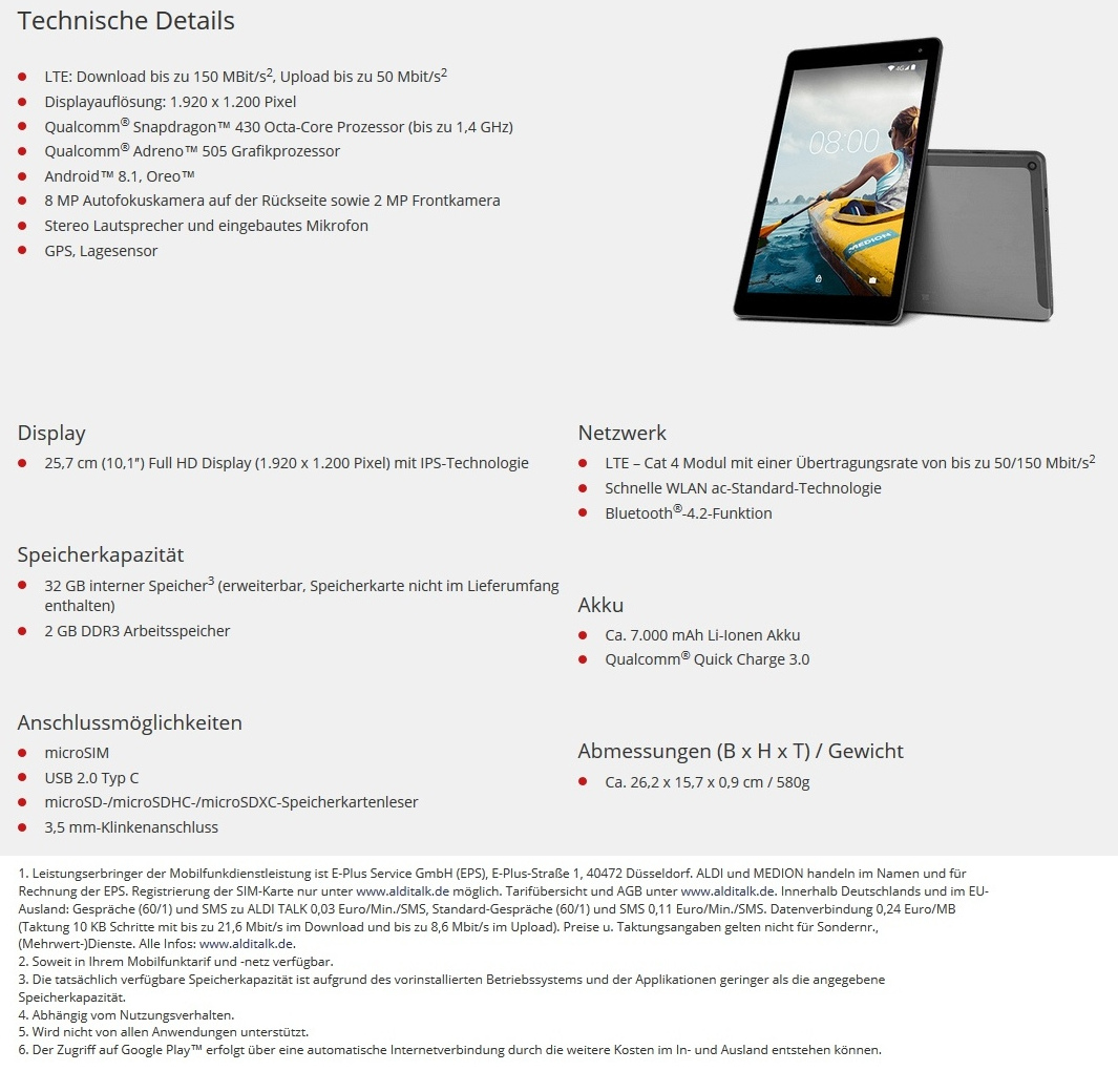 Ab Donnerstag, den 25. Oktober hat Aldi Süd wieder jede Menge PC-Technik von Medion in den Regalen. Während die beiden Laptops Akoya S6426 und S6625 sowie der P62020 Tower lediglich bei Aldi Süd verkauft werden, haben Süd und Aldi Nord das Android 8.1 Oreo basierte 10,1-Zoll-Tablet Lifetab P10610 (MD 61078) bundesweit für kurze Zeit im Sortiment. Als Preis für das Aldi-Tablet ruft der Discounter in seinen Aldi-Filialen jeweils knapp 200 Euro auf.