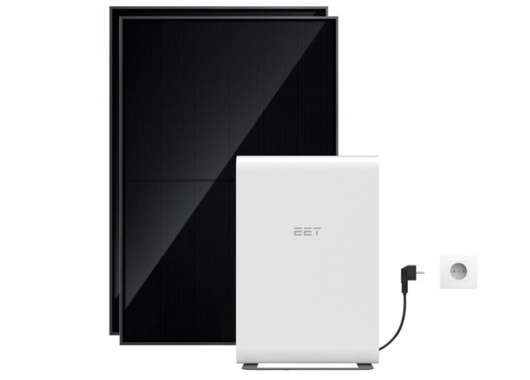 Der EET SolMate ist ein PV-Speicher samt integriertem Wechselrichter. Die steckerfertige und einfach zu installierende Balkonkraftwerk-Lösung weist eine Kapazität von 1,44 kWh auf und kann eine PV-Leistung von bis zu 2.000 Wp aufnehmen. So können theoretisch noch mehr Solarmodule als die beiden im Bundle enthaltenen mit 860 Wp angeschlossen werden.