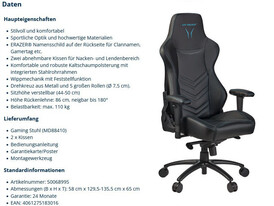 Integrierte 3D-Armlehnen mit abnehmbaren Polstern, eine Wipp- und Feststellfunktion, ein abnehmbares Namensschild auf der Rückseite, 2 abnehmbare Kissen für Rücken- und Kopfbereich sowie eine maximale Belastbarkeit von 110 kg runden das Featureset des Aldi-Stuhls ab. Aldi nennt für den Erazer X89410 (MD88410) Abmessungen von 58 x 129,5 bis 135,5 x 65 cm (Breite x Höhe x Tiefe) und ein Gewicht von etwa 26 kg. Der Erazer X89410 (MD88410) Gamer-Sessel eignet sich für Körpergrößen zwischen 1,75 und 1,95 m, die vergleichsweise engen Seitenflügeln könnten breitere Gamer allerdings einengen. Als Alternative bietet sich unter anderem der DX Racer für 189 Euro an.