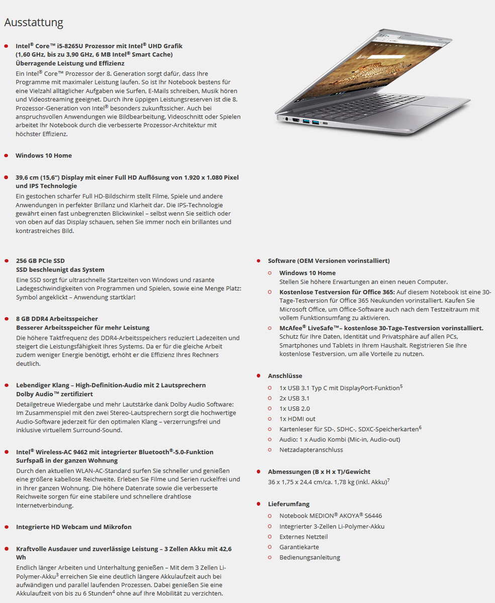 Neben performanten Gaming-Laptops und und starken Desktop-PCs zum Zocken bietet Discounter Aldi ab dem 29. August in seinen Filialen im Norden auch ein schickes 15,6-Zoll-Notebook an. Bei diesem Aldi-Angebot für knapp 550 Euro handelt es sich um das Medion Akoya S6446 (MD63420) mit Intel Core i5-8265U 4-Kern-Prozessor (8 Threads) der Generation Whiskey Lake.