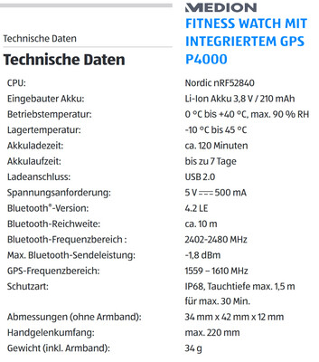 Discounter Aldi hat die schlicht gehaltene Medion Life P4000 Fitness Watch bereits mehrmals in seinen Aldi-Filialen verkauft. Jetzt ist der Multi-Sport-Tracker mit IP68-Schutz gegen Staub und Wasser und 1,3-Zoll-Farb-Touchscreen wieder für kleines Geld bei Aldi Nord erhältlich. Der Sport-Tracker P4000 von Aldi bietet neben GPS zudem Herzfrequenzmesser, Schrittzähler, verschiedene Multi-Sport-Modi, eine Wetteranzeige, Wecker sowie über die Medion Fitness App eine Kalorienverbrauchsberechnung und Schlaftracking. Eine SpO2-Funktion hat die P4000 nicht.