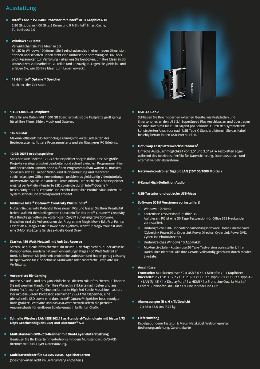 Microsoft Windows 10 Home als Betriebssystem, WLAN 802.11 ac, Bluetooth 5.0, ein Multistandard-DVD-/CD-Brenner mit Dual-Layer-Unterstützung sowie ein Multikartenleser für SD-/MS-/MMC-Speicherkarten und der Hot-Swap Festplattenwechselrahmen für das einfache Austauschen von Fesplatten rundet die Ausstattung des Medion P62020 ab. Ein beiliegender Gutschein für das Intel Optane Creativity Plus Bundle rundet das gesamte Paket ab.