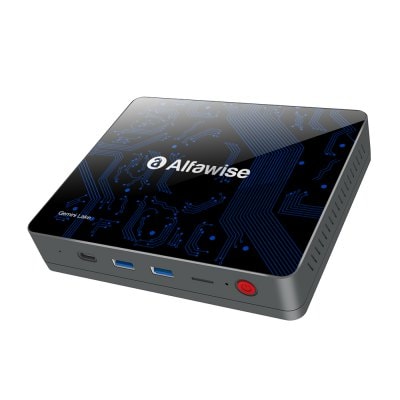 Der lediglich 16,0 x 13,5 x 3,2 Zentimeter große Mini-PC kommt mit einem Intel Celeron N4100. Der mit vier Rechenkernen ausgestattete Gemini-Lake-Prozessor taktet mit bis zu 2,4 GHz. Der Hauptspeicher ist vier Gigabyte groß, der eMMC-Speicher 64 GByte. Eine Montage einer M.2-SSD ist möglich, zusätzlich lässt sich ein 2,5-Zoll-Laufwerk nachrüsten.