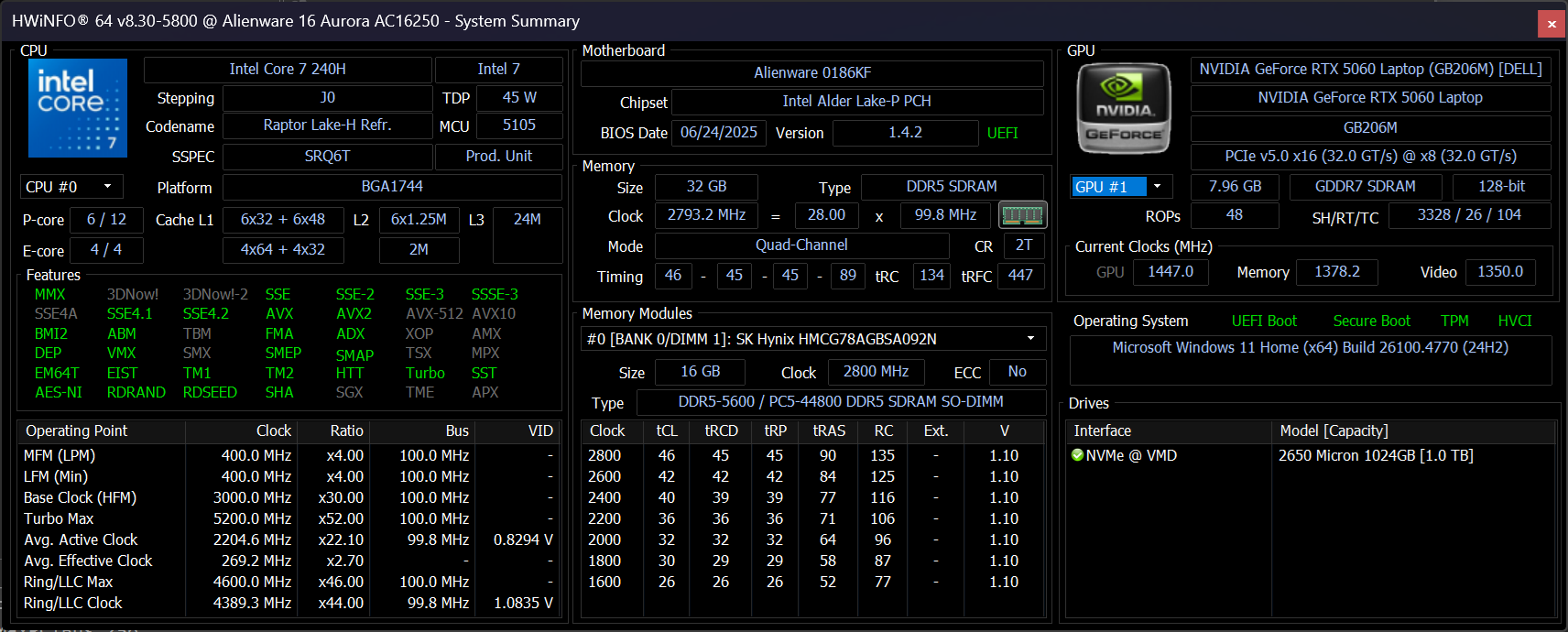 | Alienware 16 Aurora Intel Core 7 240H ⎘ NVIDIA GeForce RTX 5060 Laptop ⎘ 32 GB RAM | Amazon: Geizhals Suche | 2.6 kg | 15.2 mm | 16.00" 2560x1600 189 PPI IPS | |