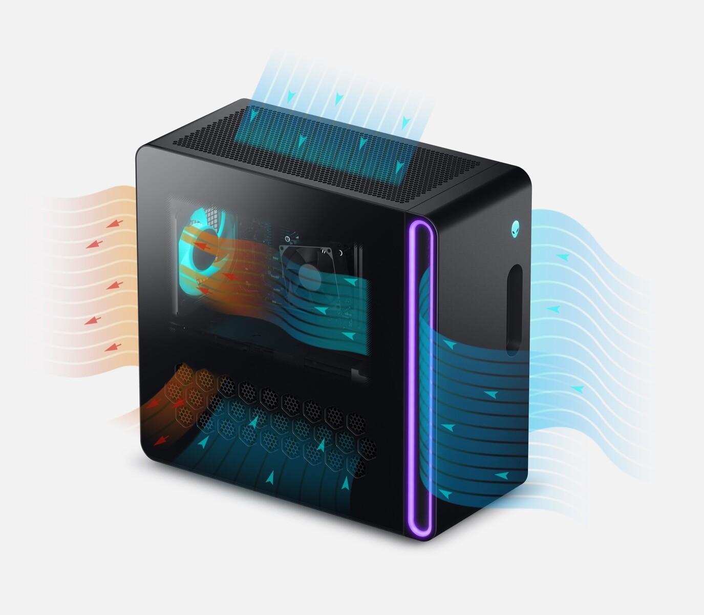 Mit Lüftungsöffnungen oben, hinten, an einer Seite und auf beiden Seiten des Frontpanels ist das neue Gehäuse ein massiver Schritt nach vorne. Laut Dell führen diese Anpassungen zu einem leiseren Gaming-Rechner mit niedrigeren CPU- und GPU-Temperaturen. Das Sichtfenster im Seitenpanel bleibt eine kostenpflichtige Upgrade-Option, genau wie der All-in-One-CPU-Kühler. Den Bildern nach zu urteilen sind das Mainboard und das Netzteil weiterhin in einem proprietären Format ausgeführt, und können so nicht einfach vom Nutzer ersetzt werden.