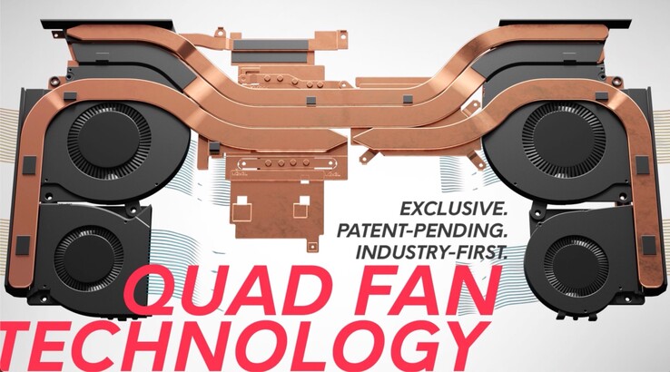 Die Technik bietet dem Teaser zufolge vor allem zwei Highlights. Einerseits das Kühlsystem, dieses basiert auf gleich vier Lüftern in Kombination mit massiven Heatpipes aus Kupfer, sodass eine enorme Menge an Wärme abgeführt werden kann. Die schiere Masse des Kühlkörpers könnte außerdem bedeuten, dass das Kühlsystem deutlich leiser arbeitet als man es von modernen Gaming-Notebooks gewohnt ist.