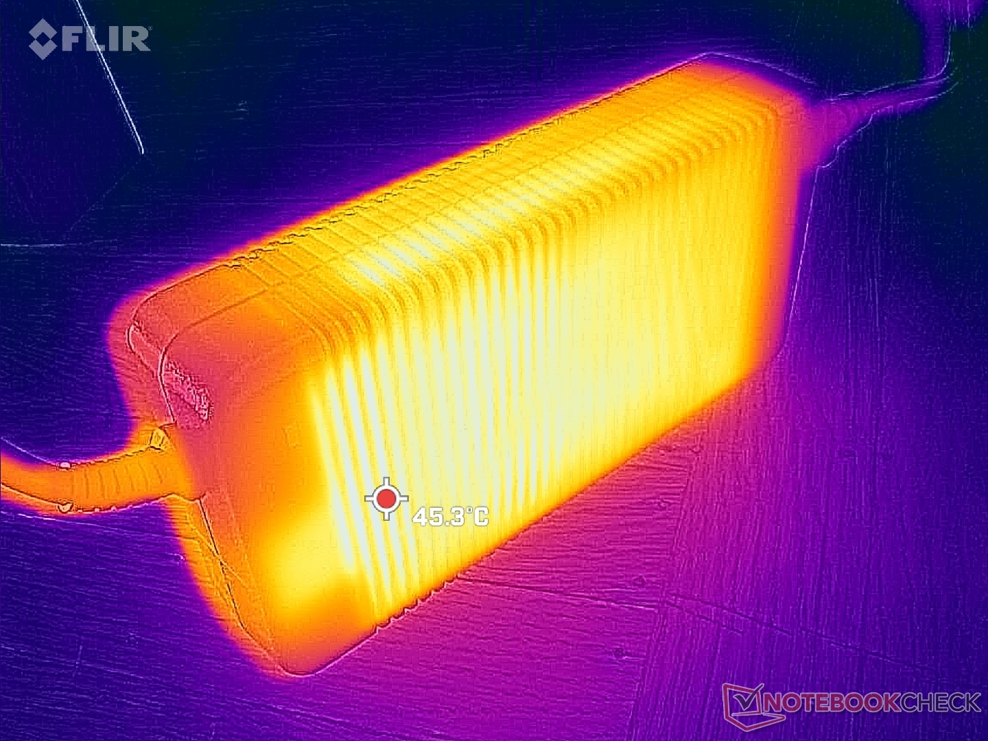 Bei 100-prozentiger Auslastung von CPU und GPU konnten wir einen maximalen Stromverbrauch von 339 Watt messen. Das sperrige Netzteil (~19,5 x 9,8 x 4 cm) ist für 330 W ausgelegt, so dass unser voll konfiguriertes Gerät die verfügbare Leistung voll ausnutzt. Zu beachten ist, dass sich die Ladegeschwindigkeit des Laptop-Akkus während des Spielens verlangsamt. Tatsächlich können wir beobachten, dass unser Akku von 100 % auf 91 % fällt, wenn wir extrem anspruchsvolle Aufgaben wie Prime95 und FurMark gleichzeitig ausführen.